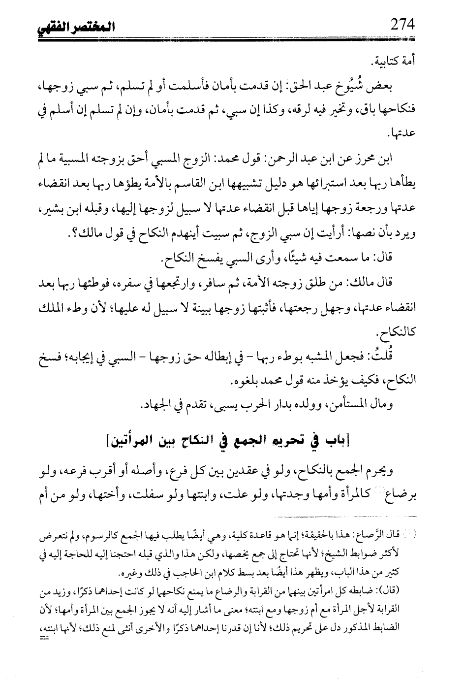ابن محرز عن ابن عبد الرحمن: قول محمد: الزوج المسبي أحق بزوجته المسبية ما لم يطأها ربها بعد استبرائها هو دليل تشبيهها ابن القاسم بالأمة يطؤها ربها بعد انقضاء عدتها ورجعة زوجها إياها قبل انقضاء عدتها لا سبيل لزوجها إليها، وقبله ابن بشير، ويرد بأن نصها: أرأيت إن سبي الزوج، ثم سبيت أينهدم النكاح في قول مالك؟