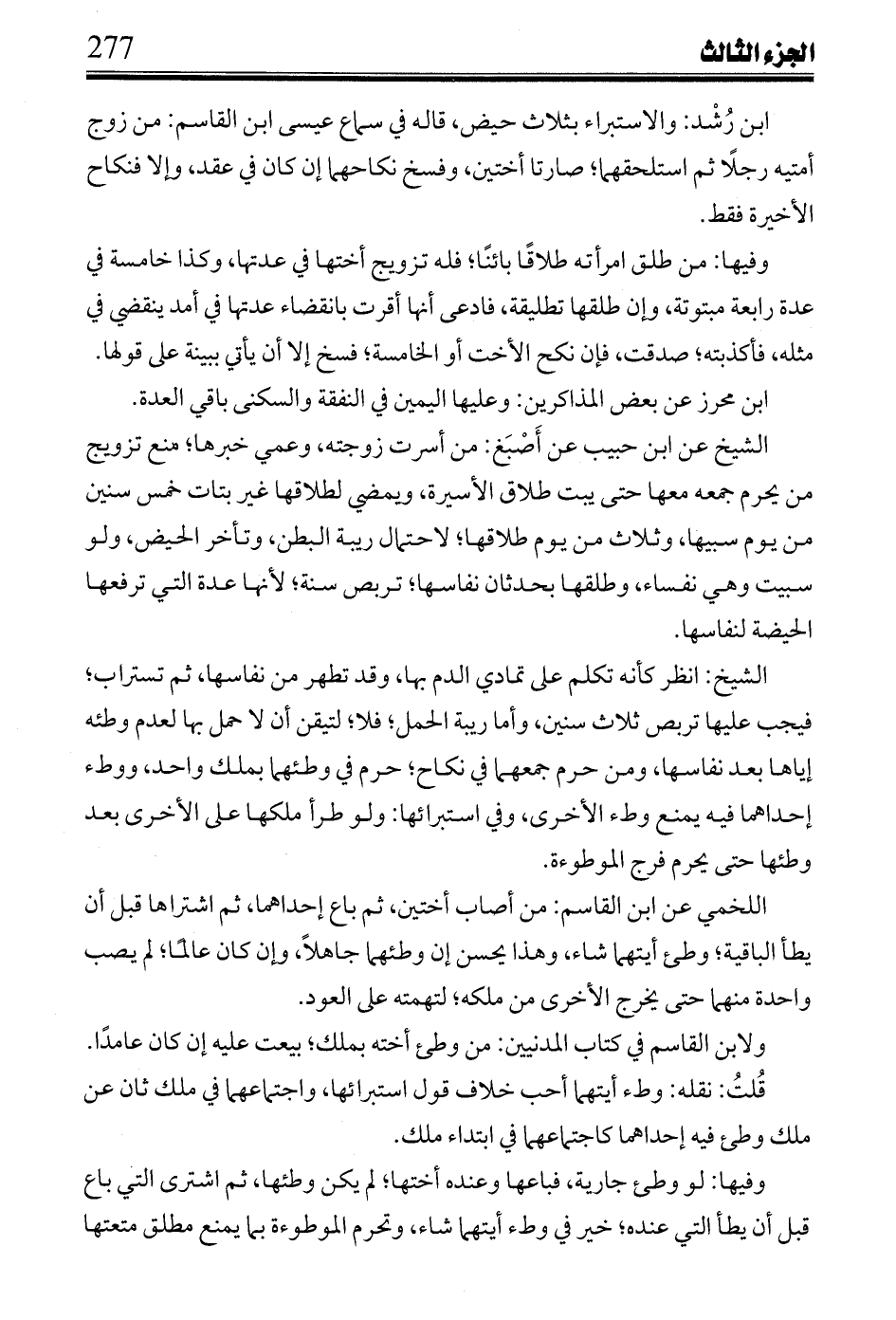 ابن رشد: والاستبراء بثلاث حيض، قاله في سماع عيسى ابن القاسم: من زوج أمتيه رجلاً ثم التلحقهما، صارتا أختين، وفسخ نكاحهما إن كان في عقد، وإلا فنكاح الأخيرة فقط.