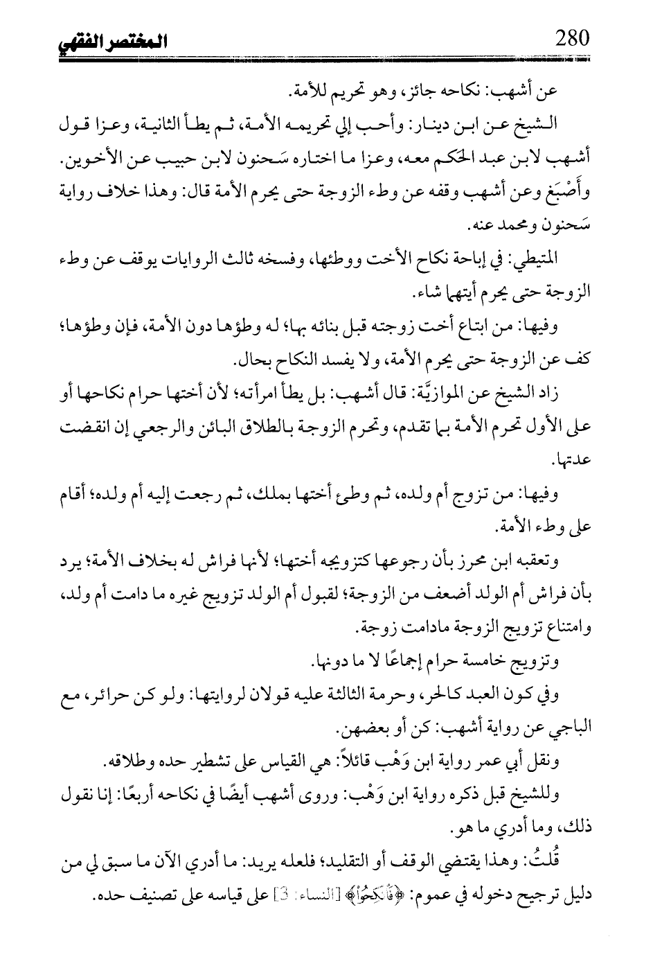 وفيها: من ابتاع أخت زوجته قبل بنائه بها؛ له وطؤها دون الأمة، فإن وطؤها؛ كف عن الزوجة حتى يحرم الأمة، ولا يفسد النكاح بحال.