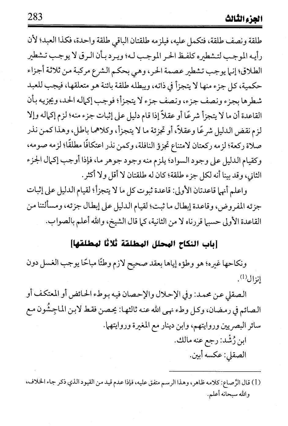 طلقة ونصف طلقة، فتكمل عليه، فيلزمه طلقتان الباقي طلقة واحدة، فكذا العبد؛ لأن رأيه الموجب لتشطيره كلفظ الحر الموجب له؛ ويرد بأن الرق لا يوجب تشطير الطلاق؛ إنما يوجب تشطير عصمة الحر، وهي بحكم الشرع مركبة من ثلاثة أجزاء حكمية، كل جزء منها لا يتجزأ في ذاته، ويبطله طلقة بائنة هو متعلقها، فيجب للعبد شطرها بجزء ونصف جزء، ونصف جزء لا يتجزأ؛ فوجب إكماله الحد، ويجزيه بأن القاعدة أن ما لا يتجزأ شرعًا أو عقلاً إذا قام دليل على إثبات جزء منه؛ لزم إكماله وإلا لزم نقض الدليل شرعًا وعقلاً، أو تجزئة ما لا يتجزأ، وكلاهما باطل، وهذا كمن نذر صلاة ركعة؛ لزمه ركعتان لامتناع تجزؤ النافلة، وكمن نذر اعتكافًا مطلقًا؛ لزمه صومه، وكقيام الدليل على وجود السواد؛ يلزم منه وجود جوهر ما، فإذا أوجب إكمال الجزء الثاني، وقد بينا أنه لكل جزء طلقة؛ كان له طلقتان لا أقل ولا أكثر.