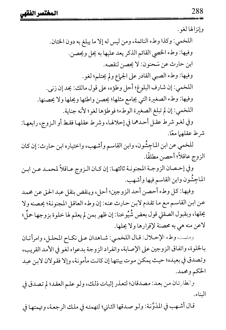 وفي إحصان الزوجة المجنونة ثالثها: إن كان الزوج عاقلاً لمحمد عن ابن الماجشون وابن القاسم فيها وأشهب.