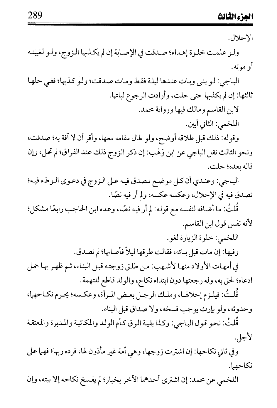 الباجي: وعندي أن كل موضع تصدق فيه على الزوج في دعوى الوطء فيه؛ تصدق فيه في الإحلال، وعكسه عكسه، ولم أر فيه نصًا.