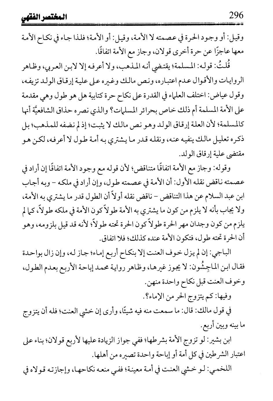 وقوله: وجاز مع الأمة اتفاقًا متناقض؛ لأن قوله مع وجود الأمة اتفاقًا إن أراد في عصمته ناقض نقله الأول: إن الأمة في عصمته طول، وإن أراد في ملكه- وبه أجاب ابن عبد السلام عن هذا التناقض- ناقض نقله أولًا أن الطول قدر ما يشتري به الأمة، ولا يجاب بأنه لا يلزم من كون ما يشتري به الأمة طولًا كون الأمة في ملكة طولًا، كما لم يلزم من كون وجدان مهر الحرة طولًا كون الحرة تحته طولًا؛ لأنه قد قيل بلزومه، وهو أن الحرة تحته طول، فتكون الأمة عنده كذلك؛ فلا اتفاق.
