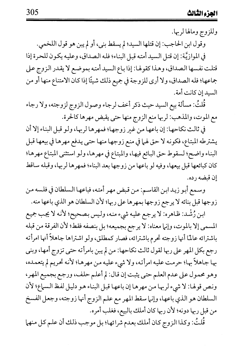 ابن رشد: ظاهره: لا يرجع عليه شيء منه، وليس بصحيح؛ لأنه لا يجب جميع المسمى إلا بالموت، وإنما معناه: لا يرجع بجميعه؛ بل بنصفه فقط؛ لأن الفرقة من قبله باشترائه عالمًا أنها زوجته تحرم باشترائه، فصار كمطلق، ولو اشتراها جاهلًا أنها امرأته رجع بكل المهر على ربها لقول ثالث نكاحها: من لم يبن بامرأته حتى تزوج أمها، وبنى بها جاهلًا بها؛ حرمت عليه امرأته، ولا شيء عليه من مهرها؛ لأنه تحريم لم يتعمده، وهو محمول على عدم العلم حتى يثبت إن قال: لم أعلم حلف، ورجع بجميع المهر، ونص قولها: لا شيء لربها من مهرها إن باعها قبل البناء هو دليل لفظ السماع؛ لأن السلطان هو الذي باعها، وإنما سقط المهر مع علم الزوج أنها زوجته، وجعل الفسخ من قبل ربها دونه؛ لأن ربها كان أملك بالبيع، فغلب أمره.