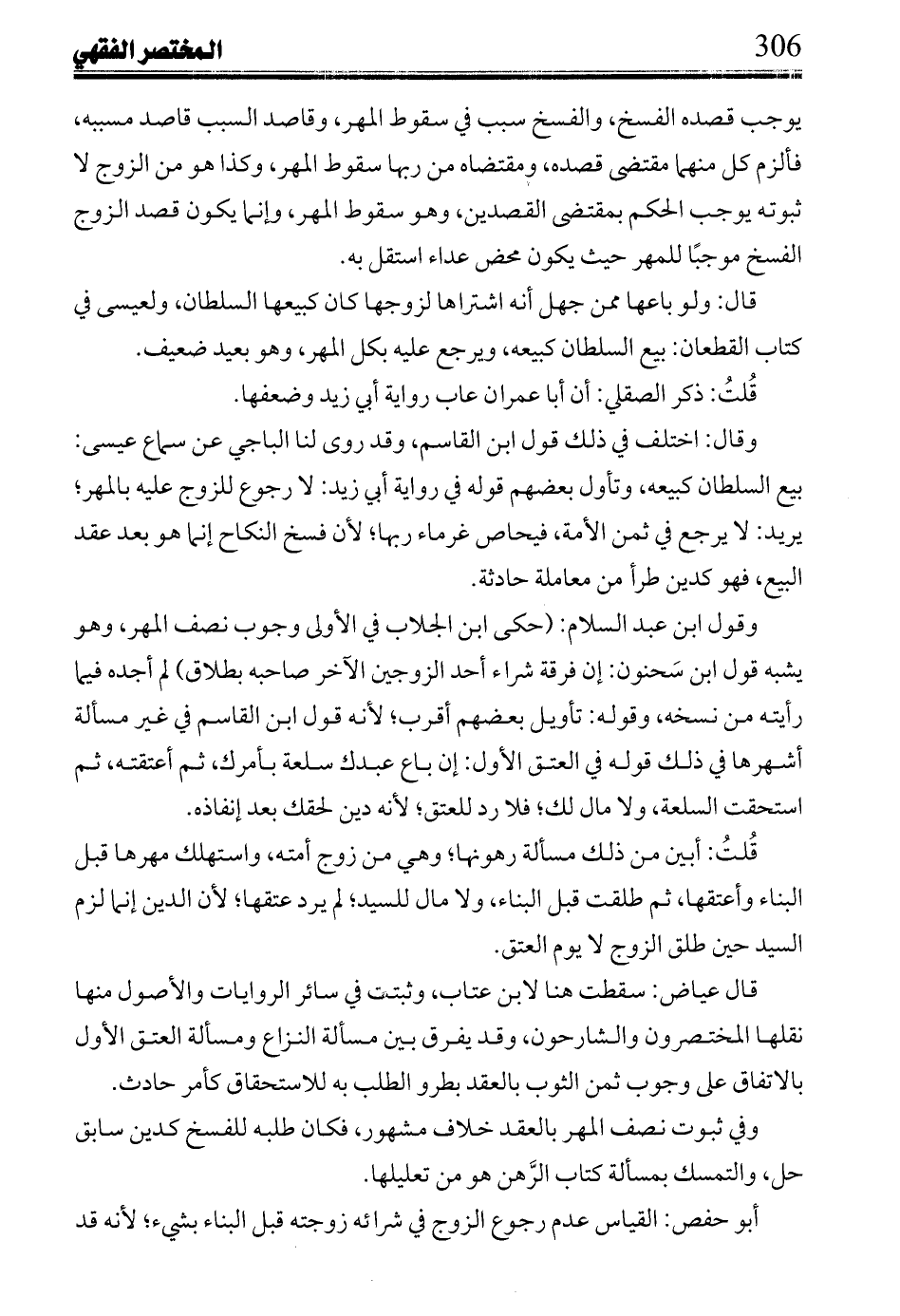 وقول ابن عبد السلام: (حكى ابن الجلاب في الأول وجوب نصف المهر، وهو يشبه قول ابن سحنون: إن فرقة شراء أحد الزوجين الآخر صاحبه بطلاق) لم أجده فيما رأيته من نسخه، وقوله: تأويل بعضهم أقرب؛ لأنه قول ابن القاسم في غير مسألة أشهرها في ذلك قوله في العتق الأول: إن باع عبدك سلعة بأمرك، ثم أعتقته، ثم استحقت السلعة، ولا مال لك؛ فلا رد للعتق؛ لأنه دين لحقك بعد إنفاذه.