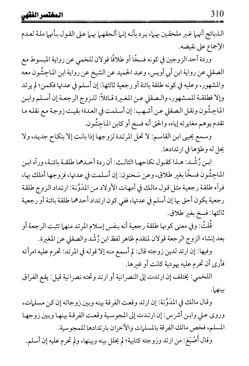ابن رشد: هذا كقول نكاحها الثالث: أن ردة أحدهما طلقة بائنة، ورآه ابن الماجشون فسخًا بغير طلاق، وعن سحنون: إن أسلمت في عدتها، فزوجها أملك بها، فرآه طلقة رجعية مثل قول مالك في أمهات الأولاد من المدونة: ارتداد الزوجة طلقة رجعية يكون أحق بها إن أسلم في عدتها، ففي كون ارتداد أحدهما طلقة بائنة أو رجعية ثالثها: فسخ بغير طلاق.
