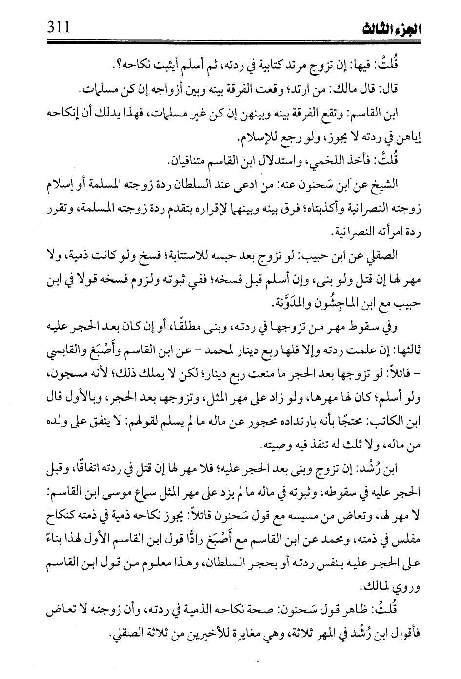 قلت: ظاهر قول سحنون: صحة نكاحه الذمية في ردته، وأن زوجته لا تعاض فأقوال ابن رشد في المهر ثلاثة، وهي مغايرة للأخيرين من ثلاثة الصقلي.
