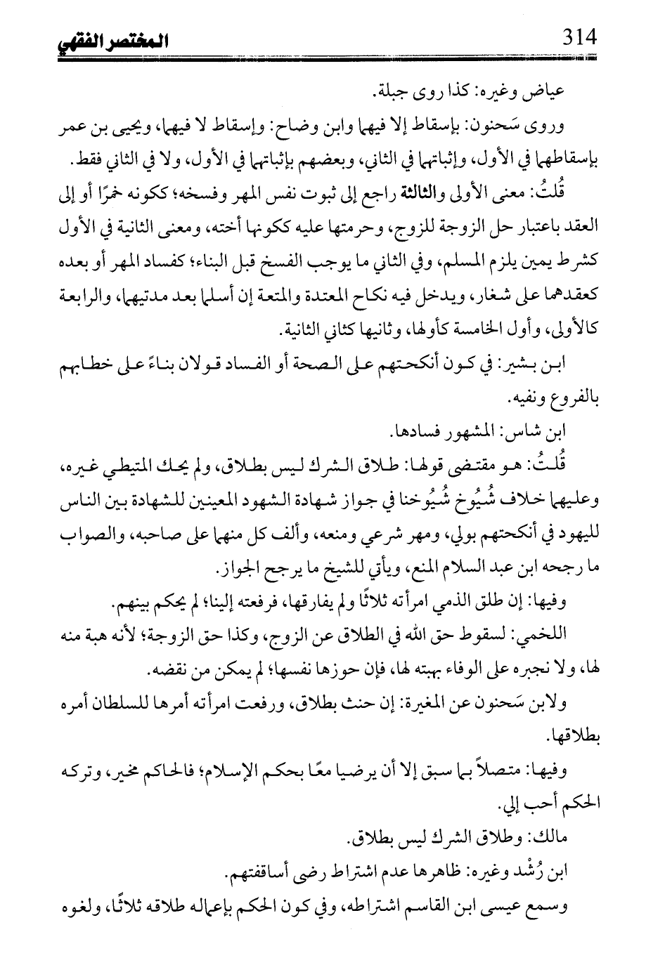 قلت: هو مقتضى قولها: طلاق الشرك ليس بطلاق، ولم يحك المتيطي غيره، وعليهما خلاف شيوخ شيوخنا في جواز شهادة الشهود المعينين للشهادة بين الناس لليهود في أنكحتهم بولي، ومهر شرعي ومنعه، وألف كل منهما على صاحبه، والصواب ما رجحه ابن عبد السلام المنع، ويأتي للشيخ ما يرجح الجواز.