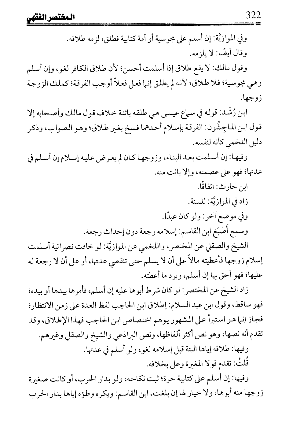 ابن رشد: قوله في سماع عيسى هي طلقه بائنة خلاف قول مالك وأصحابه إلا قول ابن الماجشون: الفرقة بإسلام أحدهما فسخ بغير طلاق؛ وهو الصواب، وذكر دليل اللخمي كأنه لنفسه.