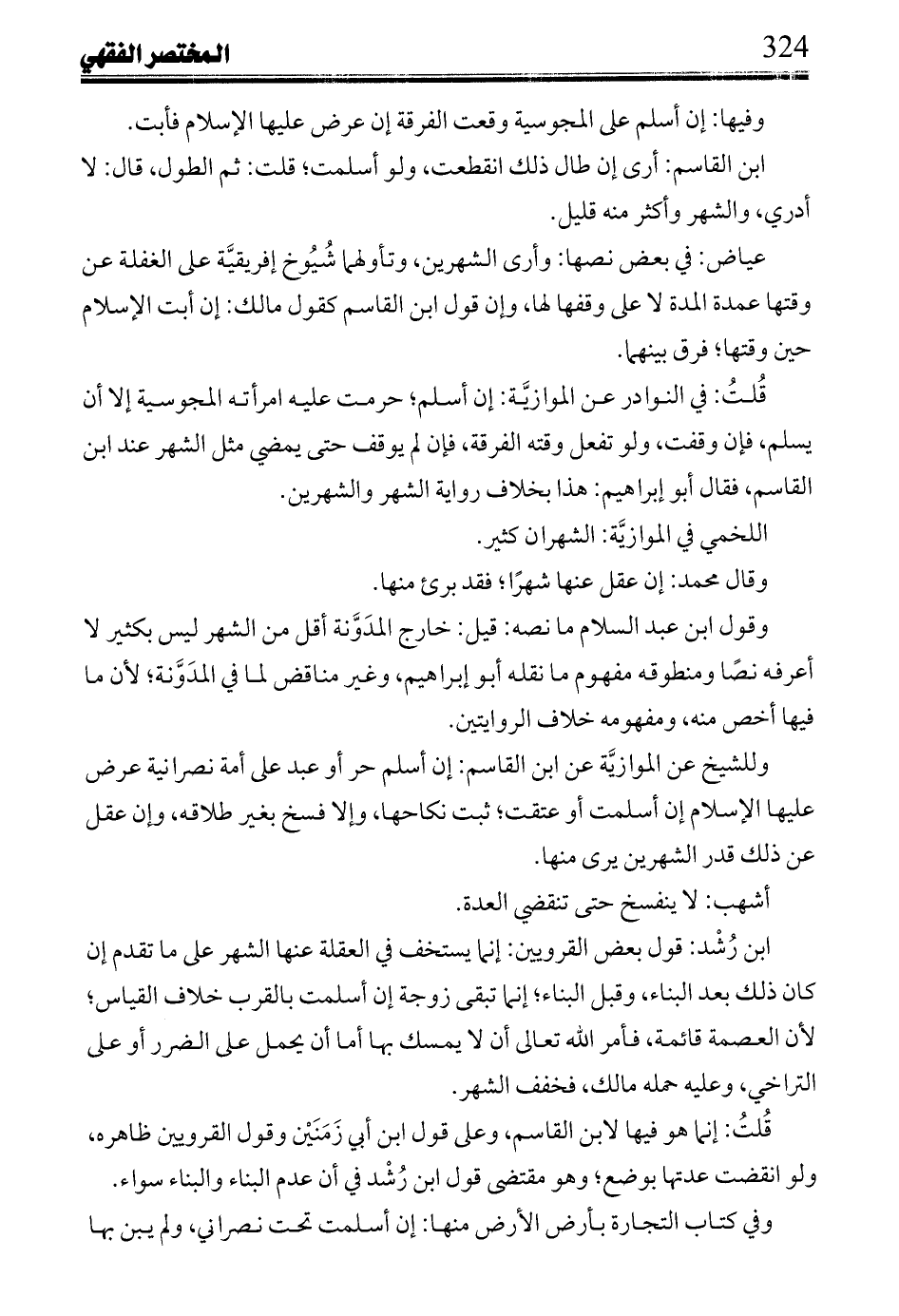 ابن رشد: قول بعض القرويين: إنما يستخف في العقلة عنها الشهر على ما تقدم إن كان ذلك بعد البناء، وقبل البناء؛ إنما تبقى زوجة إن أسلمت بالقرب خلاف القياس؛ لأن العصمة قائمة، فأمر الله تعالى أن لا يمسك بها أما أن يحمل على الضرر أو على التراخي، وعليه حمله مالك، فخفف الشهر.