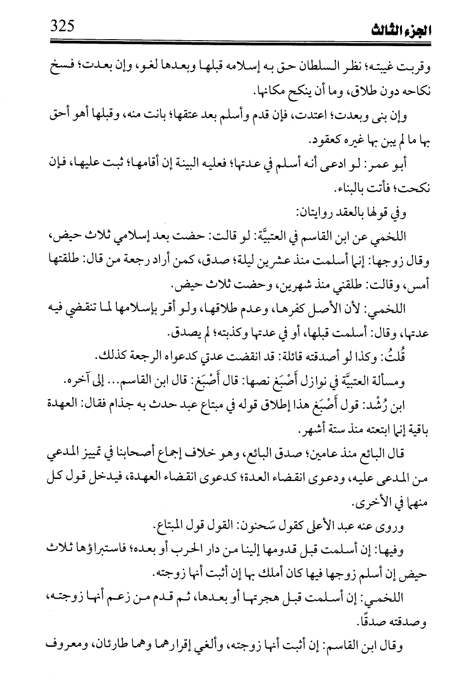 اللخمي عن ابن القاسم في التبية: لو قالت: حضنت بعد إسلامي ثلاث حيض، وقال زوجها: إنما أسلمت منذ عشرين ليلة؛ صدق، كمن أراد رجعة من قال: طلقتها أمس، وقالت: طلقني منذ شهرين، وحضت ثلاث حيض.