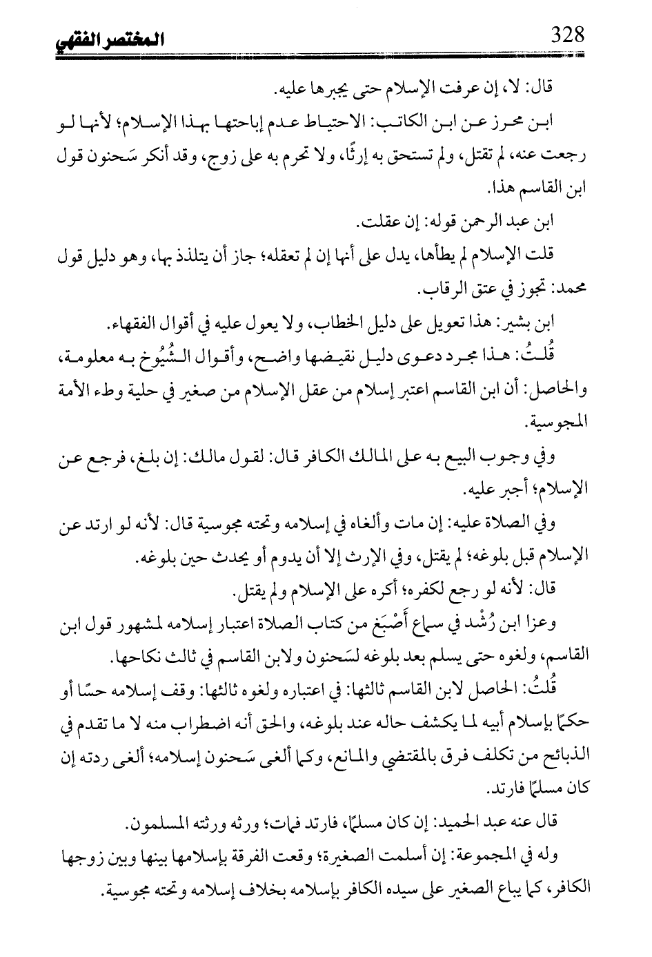 قلت: الحاصل لابن القاسم ثالثها: في اعتباره ولغوه ثالثها: وقف إسلامه حسًا أو حكمًا بإسلام أبيه لما يكشف حاله عند بلوغه، والحق أنه اضطراب منه لا ما تقدم في الذبائح من تكلف فرق بالمقتضي والمانع، وكما ألغى سحنون إسلامه؛ ألغى ردته إن كان مسلمًا فارتد.