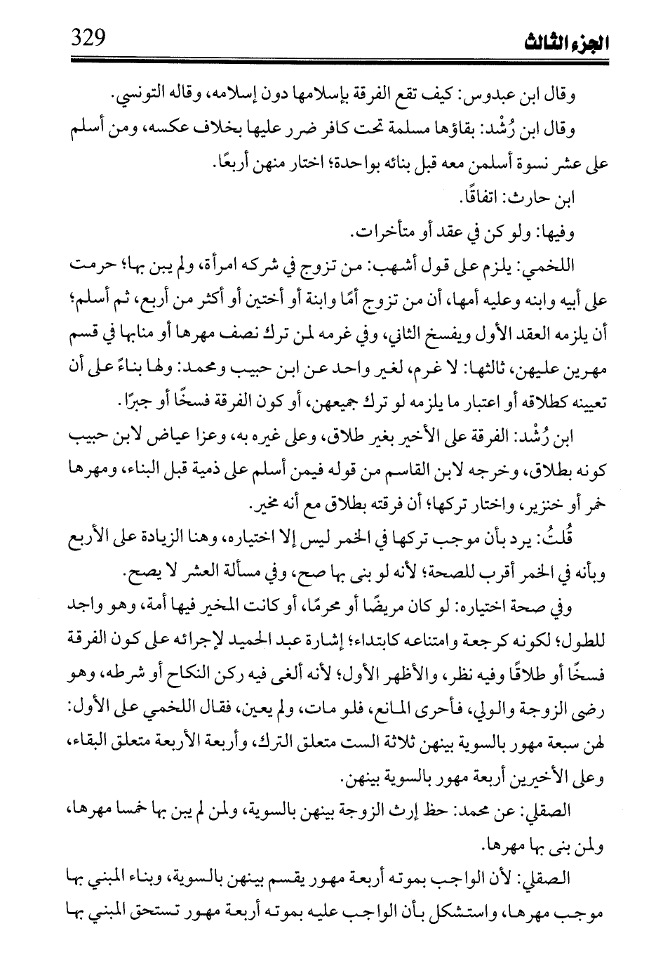 اللخمي: يلزم على قول أشهب: من تزوج في شركه امرأة، ولم يبن بها؛ حرمت على أبيه وابنه وعليه أمها، أن من تزوج أمًا وابنة أو أختين أو أكثر من أربع، ثم أسلم؛ أن يلزمه العقد الأول ويفسخ الثاني، وفي غرمه لمن ترك نصف مهرها أو منابها في قسم مهرين عليهن، ثالثها: لا غرم، لغير واحد عن ابن حبيب ومحمد: ولها بناءً على أن تعيينه كطلاقه أو اعتبار ما يلزمه لو ترك جميعهن، أو كون الفرقة فسخًا أو جبرًا.