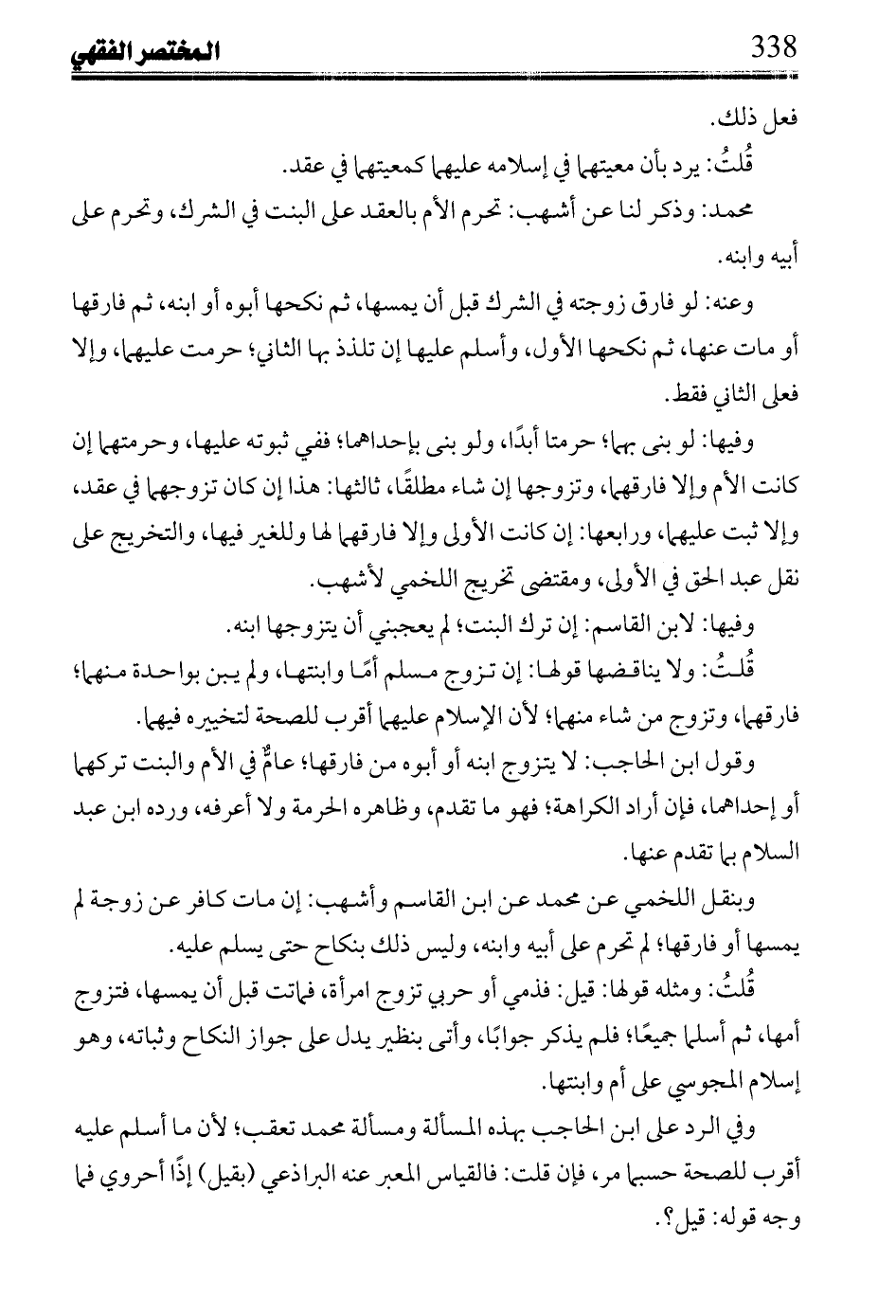 قلت: ولا يناقضها قولها: إن تزوج مسلم أمًا وابنتها، ولم يبن بواحدة منهما؛ فارقهما، وتزوج من شاء منهما؛ لأن الإسلام عليهما أقرب للصحة لتخييره فيهما.