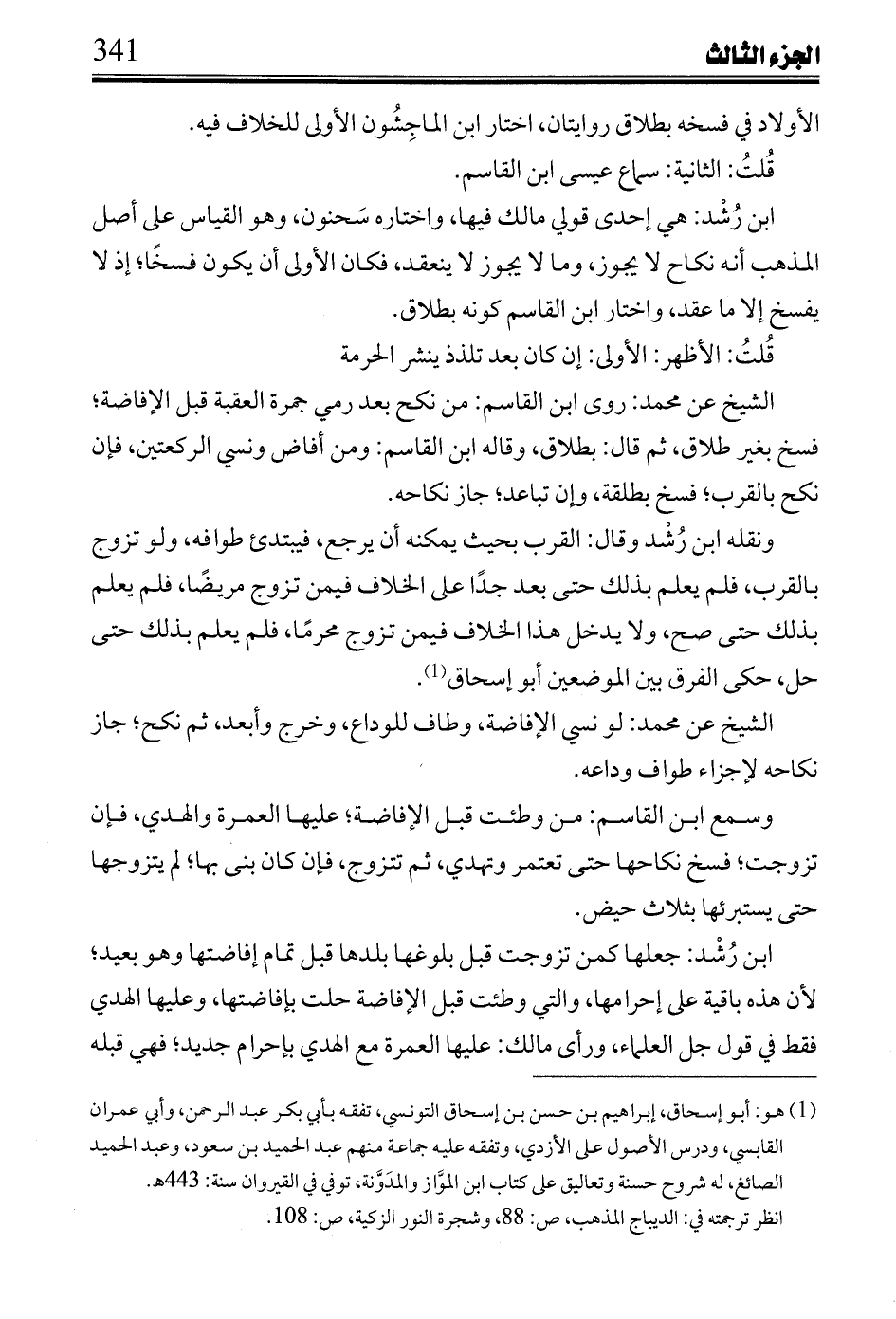 الشيخ عن محمد: روى ابن القاسم: من نكح بعد رمي جمرة العقبة قبل الإضافة؛ فسخ بغير طلاق، ثم قال: بطلاق، وقاله ابن القاسم: ومن أفاض ونسي الركعتين، فإن نكح بالقرب؛ فسخ بطلقة، وإن تباعد؛ جاز نكاحه.