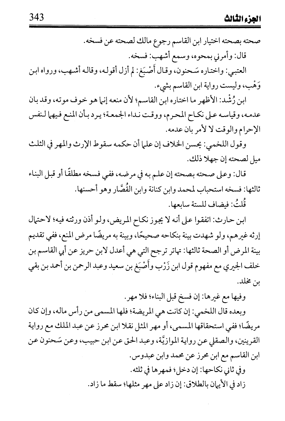 ابن حارث: اتفقوا على أنه لا يجوز نكاح المريض، ولو أذن ورثته فيه؛ لاحتمال إرثه غيرهم، ولو شهدت بينة بنكاحه صحيحًا، وبينة به مريضًا مرض المنع، ففي تقديم بينة المرض أو الصحة ثالثها: تهاتر ترجح التي هي أعدل لابن حريز عن أبي القاسم بن خلف الجيري مع مفهوم قول ابن زرب وأصبغ بن سعيد وعبد الرحمن بن أحمد بن بقي بن مخلد.