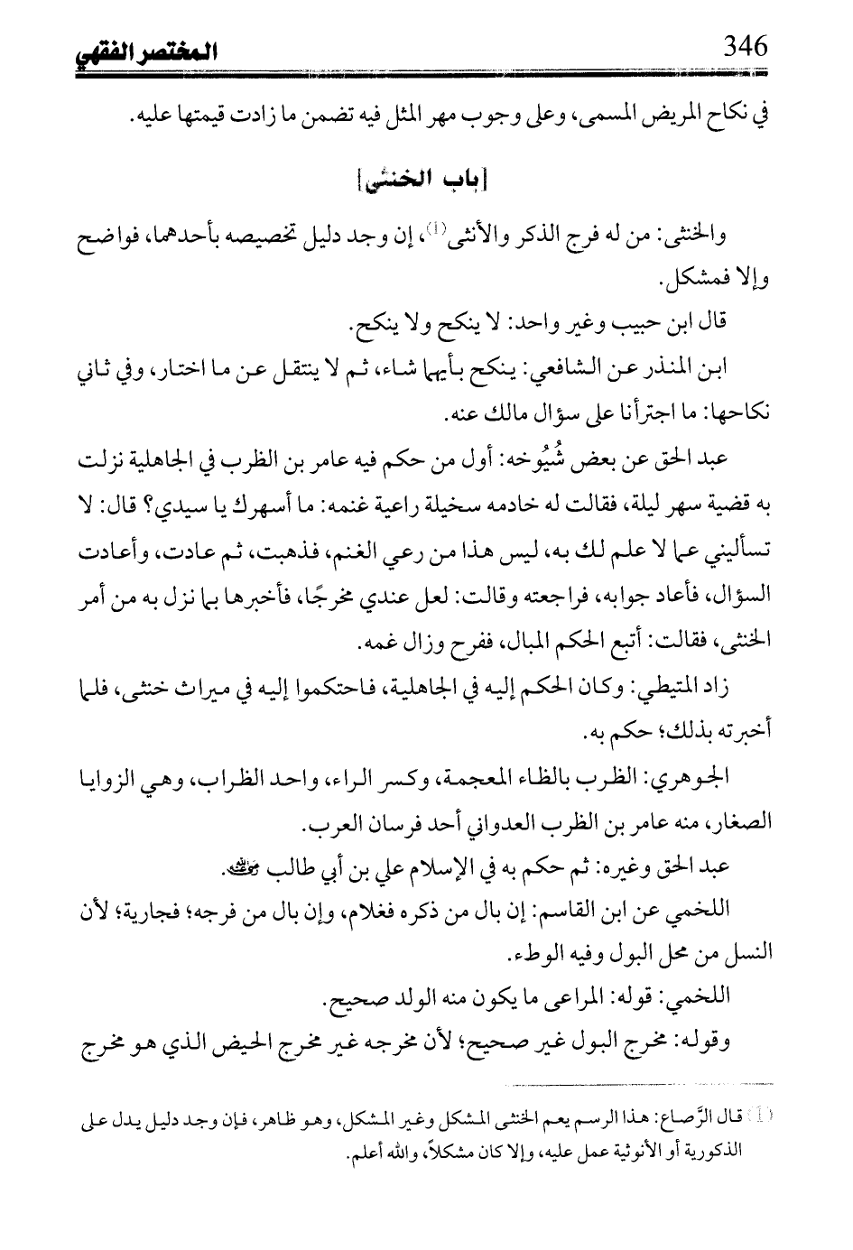 عبد الحق عن بعض شيوخه: أول من حكم فيه عامر بن الظرب في الجاهلية نزلت به قضية سهر ليلة، فقالت له خادمه سخيلة راعية غنمه: ما أسهرك يا سيدي؟ قال: لا تسأليني عما لا علم لك به، ليس هذا من رعي الغنم، فذهبت، ثم عادت، وأعادت السؤال، فأعاد جوابه، فراجعته وقالت: لعل عندي مخرجًا، فأخبرها بما نزل به من أمر الخنثى، فقالت: أتبع الحكم المبال، ففرح وزال غمه.