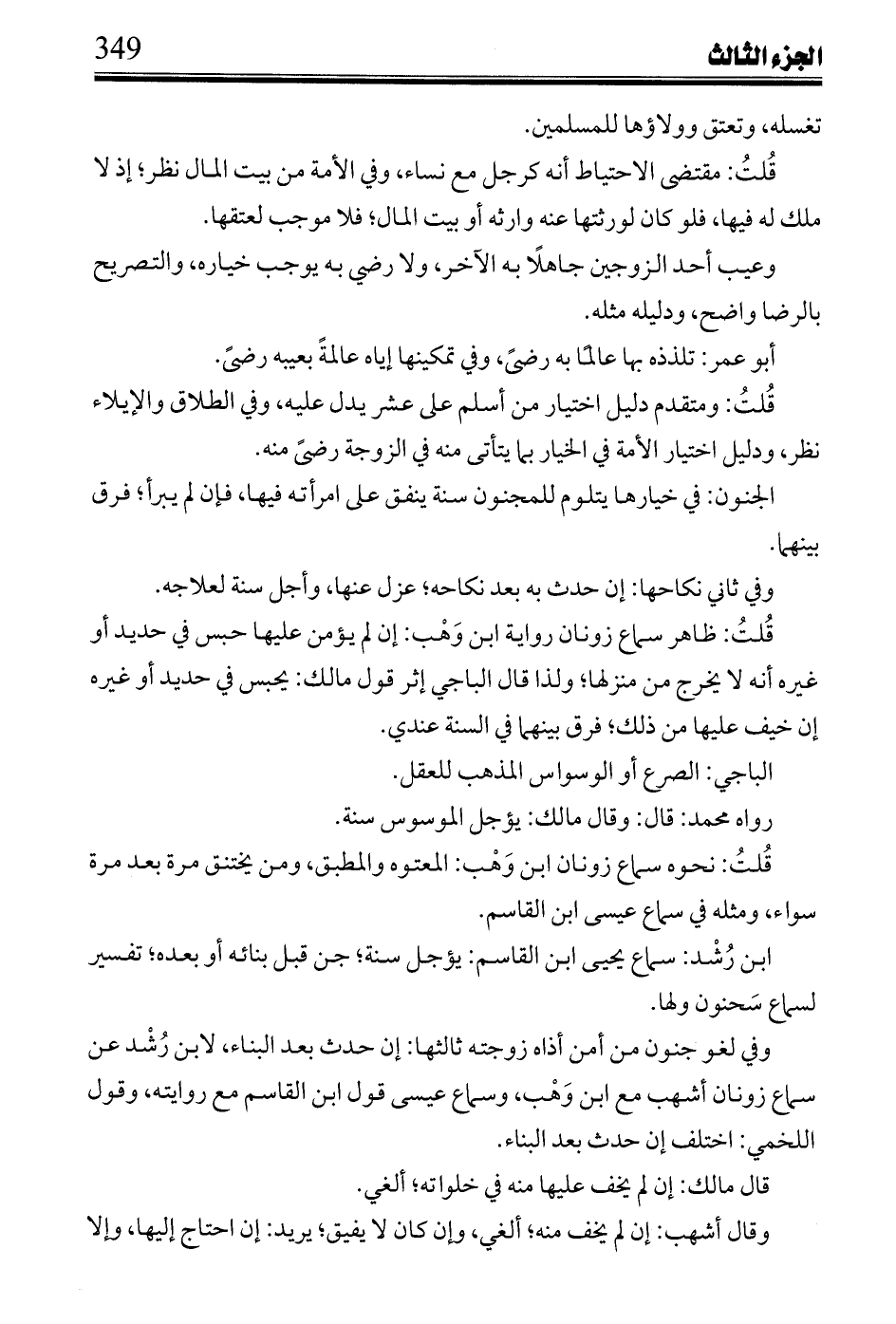 ابن رشد: سماع يحيى ابن القاسم: يؤجل سنة؛ جن قبل بنائه أو بعده؛ تفسير لسماع سحنون ولها.