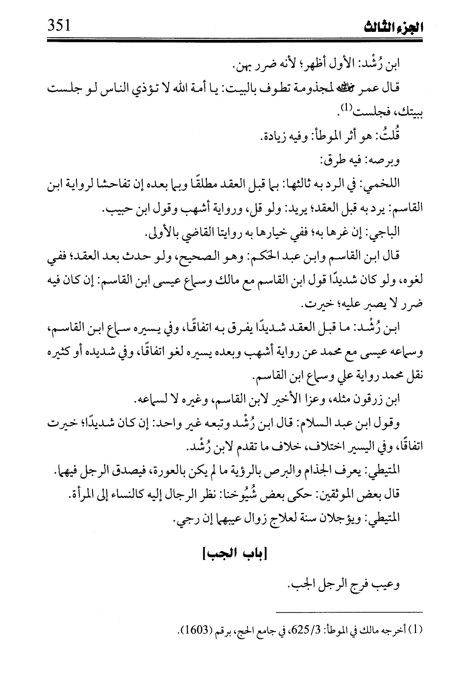 ابن رشد: ما قبل العقد شديدًا يفرق به اتفاقًا، وفي يسيره سماع ابن القاسم، وسماعهعيسى مع محمد عن رواية أشهب وبعده يسيره لغو اتفاقًا، وفي شديده أو كثيره نقل محمد رواية علي وسماع ابن القاسم.