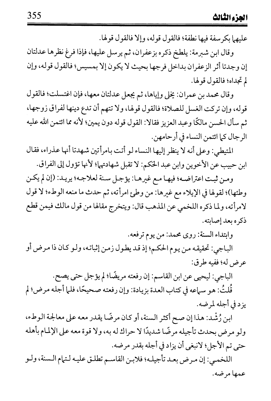 ابن رشد: هذا إن صح أكثر السنة، أو كان مرضًا يقدر معه على معالجة الوطء، ولو مرض بحدث تأجيله مرضًا شديدًا لا حراك له به، ولا قوة معه على الإلمام بأهله حتى تم الأجل؛ لا نبغى أن يزاد في أجله بقدر مرضه.
