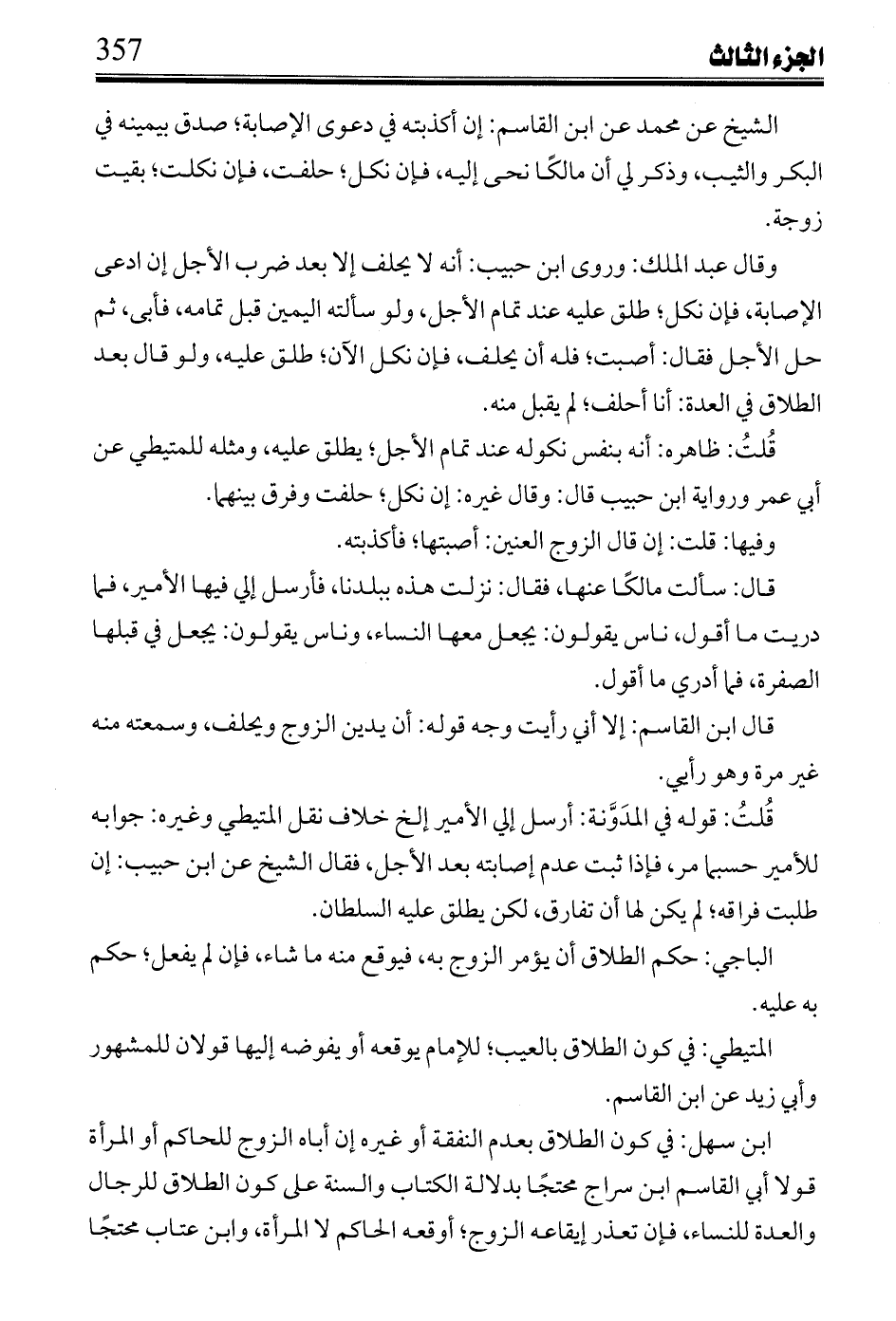 ابن سهل: في كون الطلاق بعدم النفقة أو غيره إن أباه الزوج للحاكم أو المرأة قولا أبي القاسم ابن سراج محتجًا بدلالة الكتاب والسنة على كون الطلاق للرجال والعدة للنساء، فإن تعذر إيقاعه الزوج؛ أوقعه الحاكم لا المرأة، وابن عتاب محتجًا