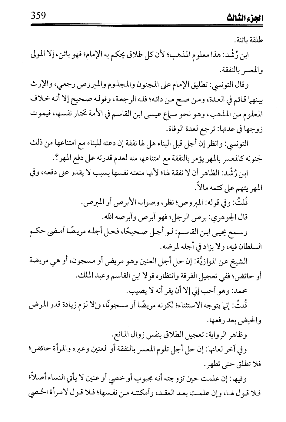وقال التونسي: تطليق الإمام على المجنون والمجذوم والمبروص رجعي، والإرث بينهما قائم في العدة، ومن صح من دائه؛ فله الرجعة، وقوله صحيح إلا أنه خلاف المعلوم من المذهب، وهو نحو سماع عيسى ابن القاسم في الأمة تختار نفسها، فيموت زوجها في عدتها: ترجع لعدة الوفاة.