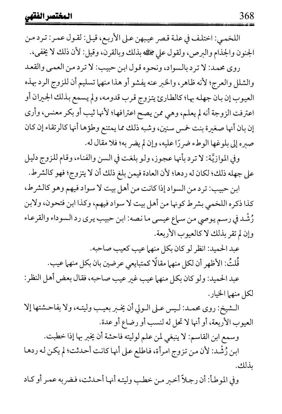 اللخمي: اختلف في علة قصر عيبهن على الأربع، قيل: لقول عمر: ترد من الجنون والجذام والبرص، ولقول علي رضي الله عنه بذلك وبالقرن، وقيل: لأن ذلك لا يخفى،.