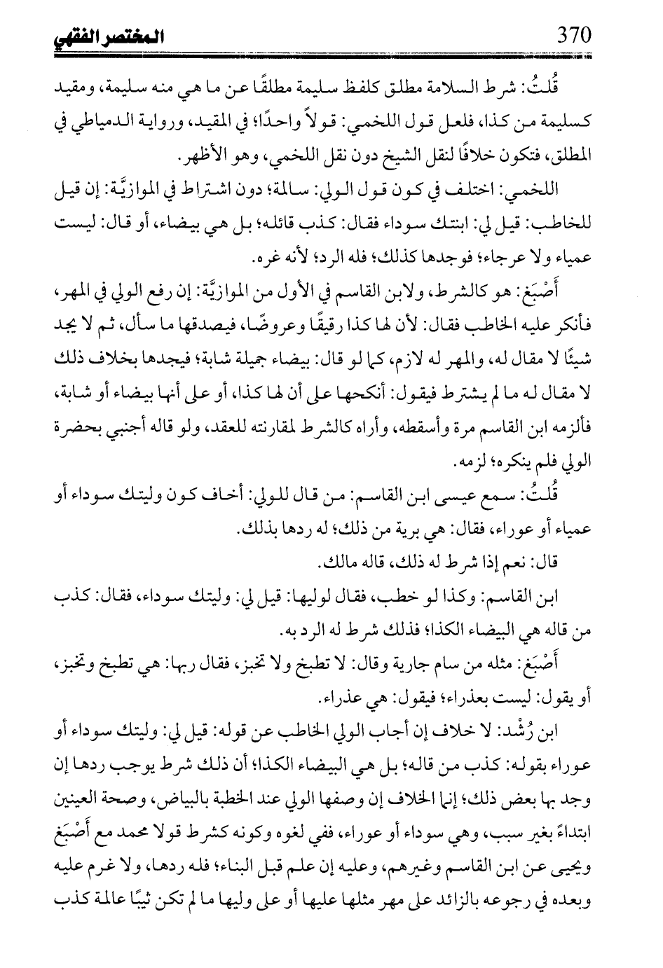 ابن رشد: لا خلاف إن أجاب الولي الخاطب عن قوله: قيل لي: وليتك سوداء أو عوراء بقوله: كذب من قاله؛ بل هي البيضاء الكذا؛ أن ذلك شرط يوجب ردها إن وجد بها بعض ذلك؛ إنما الخلاف إن وصفها الولي عند الخطبة بالبياض، وصحة العينين ابتداءً بغير سبب، وهي سوداء أو عوراء، ففي لغوه وكونه كشرط قولا محمد مع أصبغ ويحيى عن ابن القاسم وغيرهم، وعليه إن علم قبل البناء؛ فله ردها، ولا غرم عليه وبعده في رجوعه بالزائد على مهر مثلها عليها أو على وليها ما لم تكن ثيبًا عالمة كذب