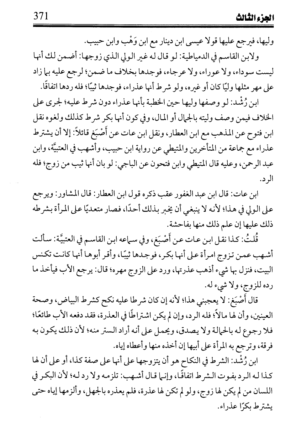 ابن رشد: الشرط في النكاح هو أن يتزوجها على أنها على صفة كذا، أو على أنها لها كذا له الرد بقوت الشرط اتفاقًا، وإنما قال أشهب: تلزمه ولا رد له؛ لأن البكر في اللسان من لم يكن لها زوج، ولو لم تكن لها عذرة، فلم يعذره بالجهل، وألزمها إياه حتى يشترط بكرًا عذراء.