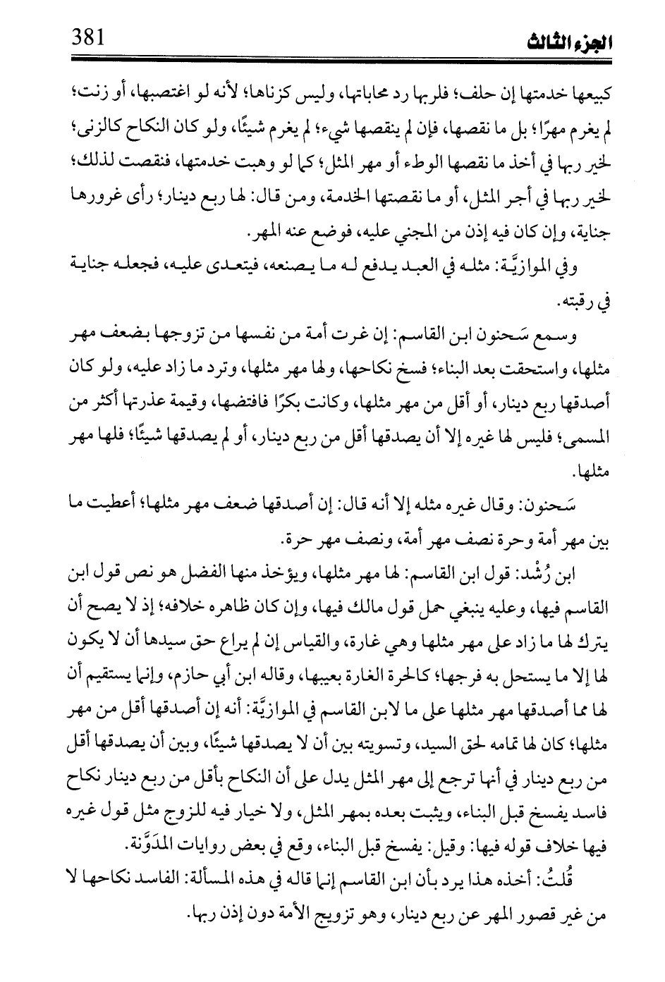 ابن رشد: قول ابن القاسم: لها مهر مثلها، ويؤخذ منها الفضل هو نص قول ابن القاسم فيها، وعليه ينبغي حمل قول مالك فيها، وإن كان ظاهره خلافه؛ إذ لا يصح أن يترك لها ما زاد على مهر مثلها وهي غارة، والقياس إن لم يراع حق سيدها أن لا يكون لها إلا ما يستحل به فرجها؛ كالحرة الغارة بعيبها، وقاله ابن أبي حازم، وإنما يستقيم أن لها مما أصدقها مهر مثلها على ما لابن القاسم في الموازية: أنه إن أصدقها أقل من مهر مثلها؛ كان لها تمامه لحق السيد، وتسويته بين أن لا يصدقها شيئًا، وبين أن يصدقها أقل من ربع دينار في أنها ترجع إلى مهر المثل يدل على أن النكاح بأقل من ربع دينار نكاح فاسد يفسخ قبل البناء، ويثبت بعده بمهر المثل، ولا خيار فيه للزوج مثل قول غيره فيها خلاف قوله فيها: وقيل: يفسخ قبل البناء، وقع في بعض روايات المدونة.