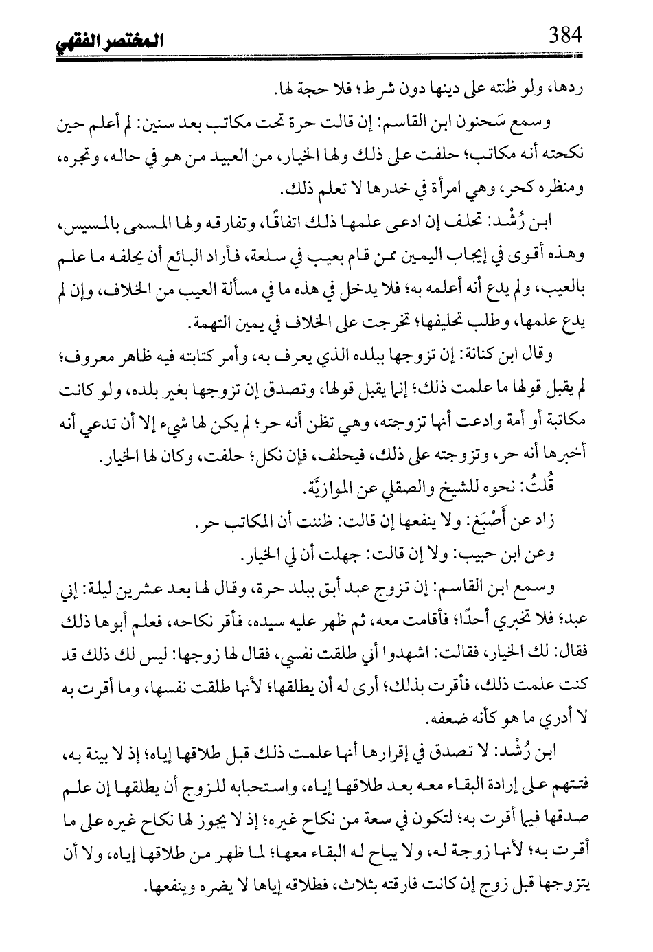 وقال ابن كنانة: إن تزوجها ببلده الذي يعرف به، وأمر كتابته فيه ظاهر معروف؛ لم يقبل قولها ما علمت ذلك؛ إنما يقبل قولها، وتصدق إن تزوجها بغير بلده، ولو كانت مكاتبة أو أمة وادعت أنها تزوجته، وهي تظن أنه حر؛ لم يكن لها شيء إلا أن تدعي أنه أخبرها أنه حر، وتزوجته على ذلك، فيحلف، فإن نكل؛ حلفت، وكان لها الخيار.