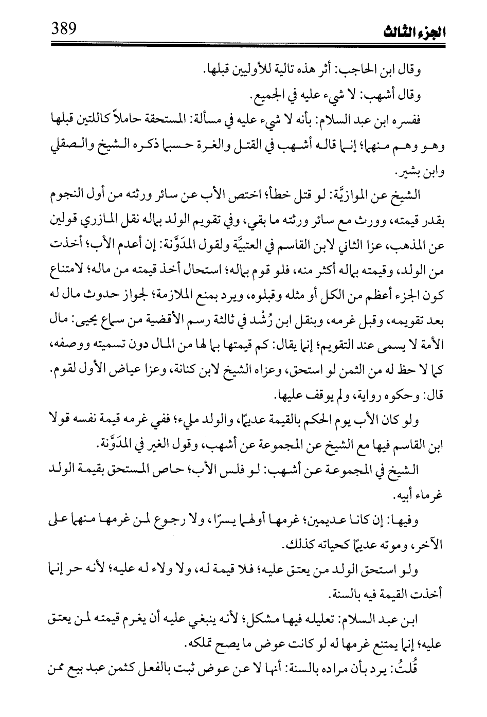 الشيخ عن الموازية: لو قتل خطأ؛ اختص الأب عن سائر ورثته من أول النجوم بقدر قيمته، وورث مع سائر ورثته ما بقي، وفي تقويم الولد بماله نقل المازري قولين عن المذهب، عزا الثاني لابن القاسم في العتبية ولقول المدونة: إن أعدم الأب؛ أخذت من الولد، وقيمته بماله أكثر منه، فلو قوم بماله؛ استحال أخذ قيمته من ماله؛ لامتناع كون الجزء أعظم من الكل أو مثله وقبلوه، ويرد بمنع الملازمة؛ لجواز حدوث مال له بعد تقويمه، وقبل غرمه، وبنقل ابن رُشد في ثالثة رسم الأقضية من سماع يحيى: مال الأمة لا يسمى عند التقويم؛ إنما يقال: كم قيمتها بما لها من المال دون تسميته ووصفه، كما لاحظ له من الثمن لو استحق، وعزاه الشيخ لابن كنانة، وعزا عياض الأول لقوم. قال: وحكوه رواية، ولم يوقف عليها.
