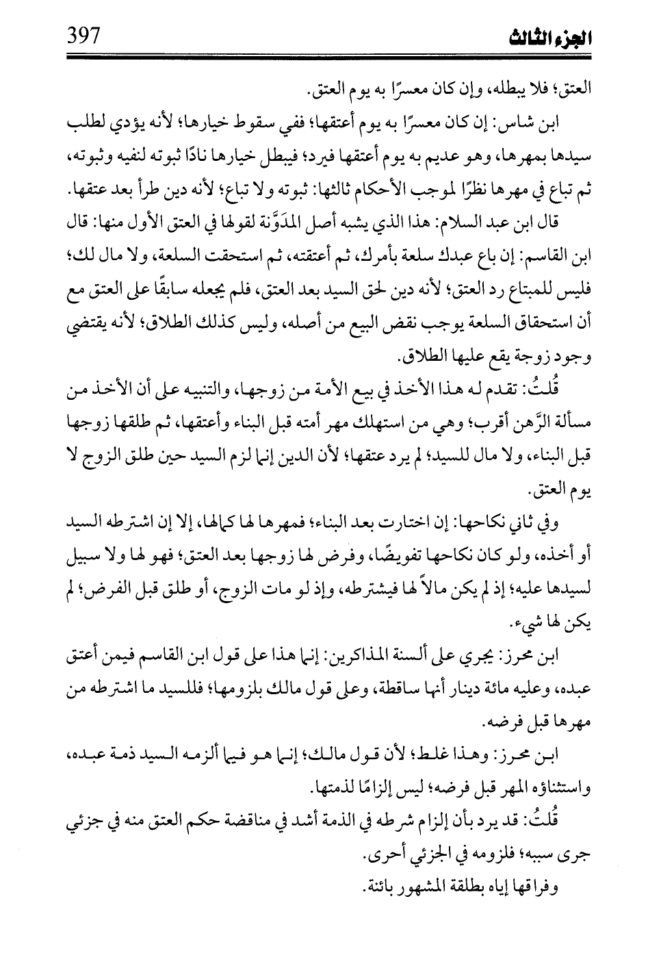 ابن محرز: يجري على ألسنة المذاكرين: إنما هذا على قول ابن القاسم فيمن أعتق عبده، وعليه مائة دينار أنها ساقطة، وعلى قول مالك بلزومها؛ فلسيد ما اشترطه من مهرها قبل فرضه.
