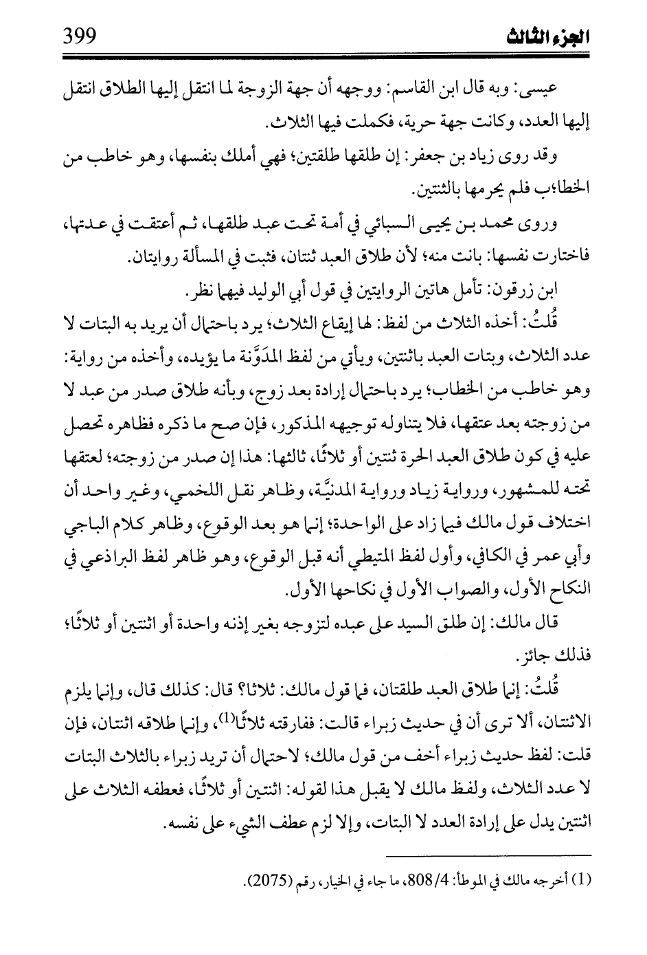 قُلتُ: إنما طلاق العبد طلقتان، فما قول مالك: ثلاثاً؟ قال: كذلك قال، وإنما يلزم الاثنتان، ألا ترى أن في حديث زبراء قالت: ففارقته ثلاثاً، وإنما طلاقه اثنتان، فإن قلت: لفظ حديث زبراء أخف من قول مالك؛ لاحتمال أن تريد زبراء بالثلاث البتات لا عدد الثلاث، ولفظ مالك لا يقبل هذا لقوله: اثنتين أو ثلاثاً، فعطفه الثلاث على اثنتين يدل على إرادة العدد لا البتات، وإلا لزم عطف الشيء على نفسه.