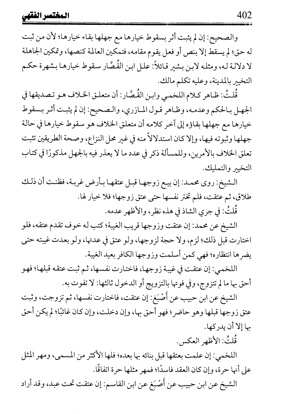 والصحيح: إن لم يثبت أثر بسقوط خيارها مع جهلها بقاء خيارها؛ لأن من ثبت له حق؛ لم يسقط إلا بنص أو فعل يقوم مقامه، فتمكين العالمة كنصها، وتمكين الجاهلة لا دلالة له، ومثله لابن بشير قائلاً: علل ابن القُصار سقوط خيارها بشهرة حكم التخيير بالمدينة، وعليه تكلم مالك.