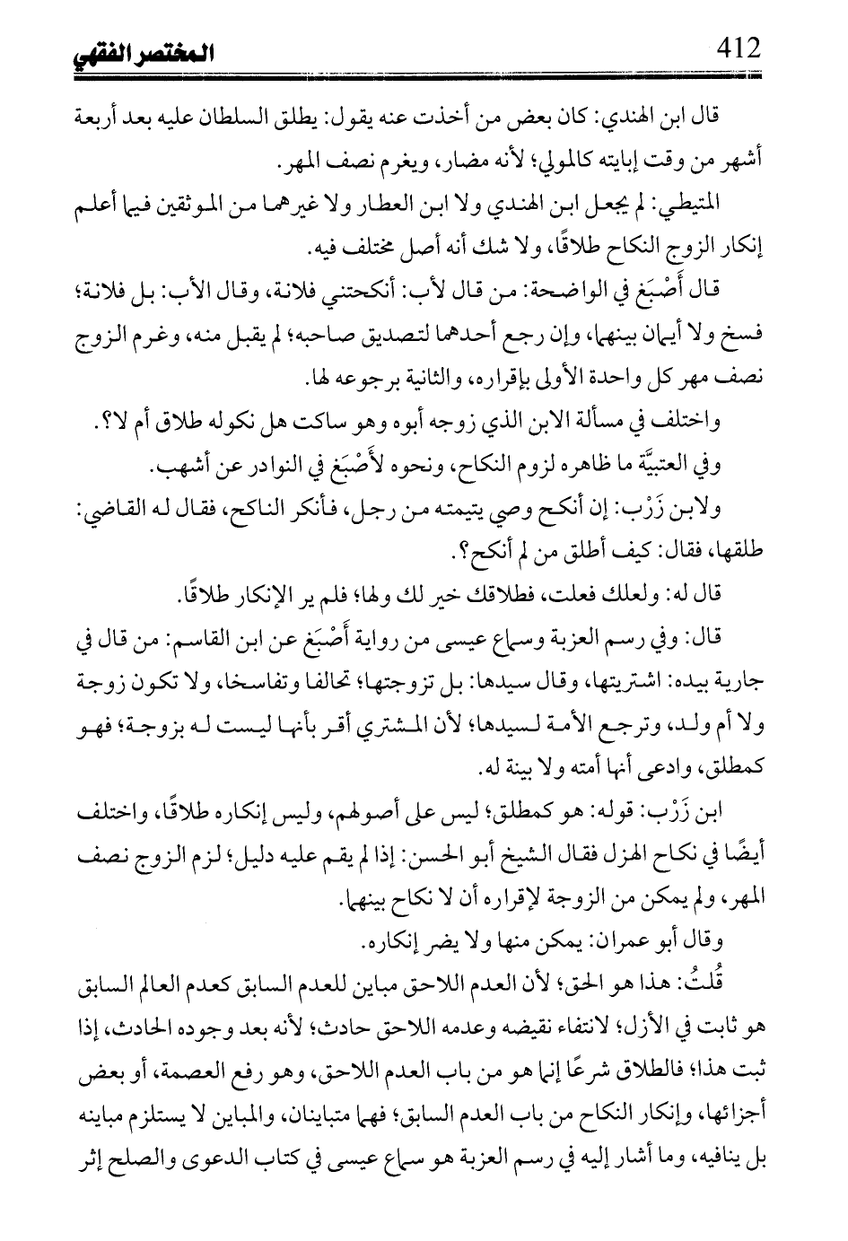 قلت: هذا هو الحق؛ لأن العدم اللاحق مباين للعدم السابق كعدم العالم السابق هو ثابت في الأزل؛ لإنتفاء نقيضه وعدمه اللاحق حادث؛ لأنه بعد وجوده الحادث، إذا ثبت هذا؛ فالطلاق شرعًا إنما هو من باب العدم اللاحق، وهو رفع العصمة، أو بعض أجزائها، وإنكار النكاح من باب العدم السابق؛ فهما متباينان، والمباين لا يستلزم مباينه بل ينافيه، وما أشار إليه في رسم العزبة هو سماع عيسى في كتاب الدعوى والصلح إثر
