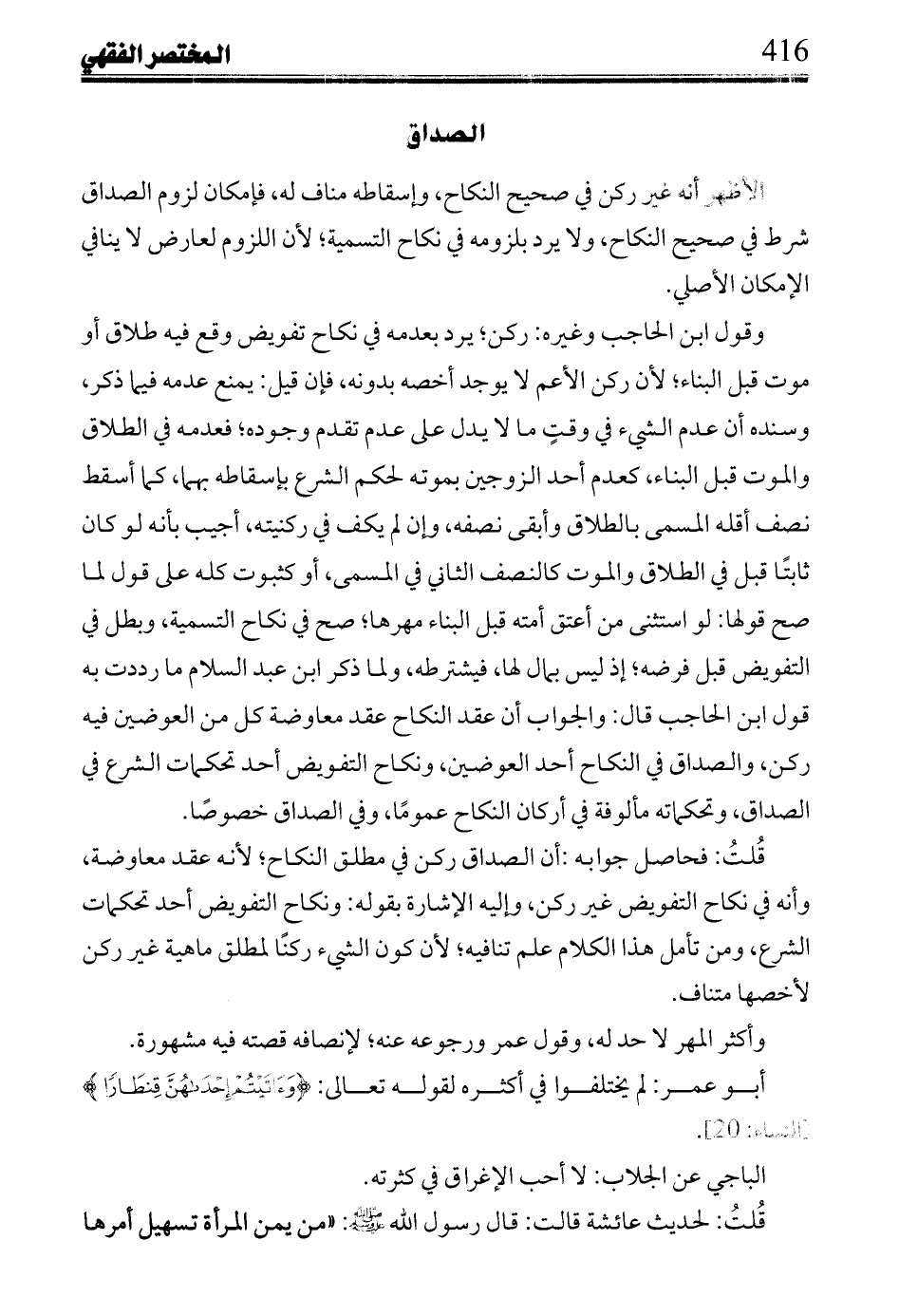 وقول ابن الحاجب وغيره: ركن؛ يرد بعدمه في نكاح تفويض وقع فيه طلاق أو موت قبل البناء؛ لأن ركن الأعم لا يوجد أخصه بدونه، فإن قيل: يمنع عدمه فيها ذكر، وسنده أن عدم الشئ في وقت ما لا يدل على عدم تقدم وجوده؛ فعدمه في الطلاق والموت قبل البناء، كعدم أحد الزوجين بموته لحكم الشرع بإسقاطه بهما، كما أسقط نصف أقله المسمى بالطلاق وأبقى نصفه، وإن لم يكف في ركنيته، أجيب بأنه لو كان ثابتًا قبل في الطلاق والموت كالنصف الثاني في المسمى، أو كثبوت كله على قول لما صح قولها: لو استثنى من أعتق أمته قبل البناء مهرها؛ صح في نكاح التسمية، وبطل في التفويض قبل فرضه؛ إذ ليس بمال لها، فيشترطه، ولما ذكر ابن عبد السلام ما رددت به قول ابن الحاجب قال: والجواب أن عقد النكاح عقد معاوضة كل من العوضين فيه ركن، والصداق في النكاح أحد العوضين، ونكاح التفويض أحد تحكمات الشرع في الصداق، وتحكماته مألوفة في أركان النكاح عمومًا، وفي الصداق خصوصًا.