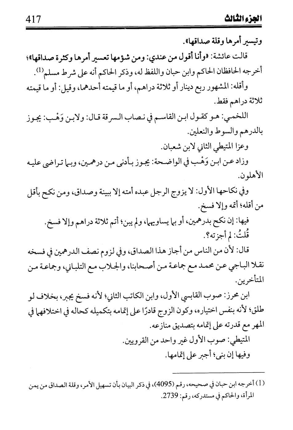 قالت عائشة: "وأنا أقول من عندي: ومن شؤمها تعسير أمرها وكثرة صداقها"؛ أخرجه الحافظان الحاكم وابن حبان واللفظ له، وذكر الحاكم أنه على شرط مسلم.
