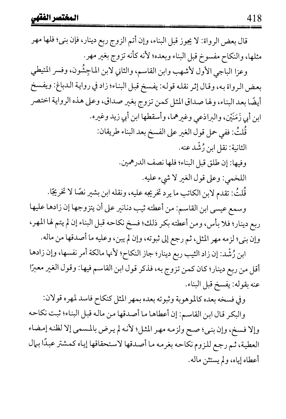 وعزا الباجي الأول لأشهب وابن القاسم، والثاني لابن الماجشون، وفسر المتيطي بعض الرواة به، وقال إثر نقله قوله: يفسخ قبل البناء؛ زاد في رواية الدباغ: ويفسخ أيضًا بعد البناء، ولها صداق المثل كمن تزوج بغير صداق، وعلى هذه الرواية اختصر ابن أبي زمنين، والبراذعي وغيرهما، وأسقطها ابن أبي زيد وغيره.