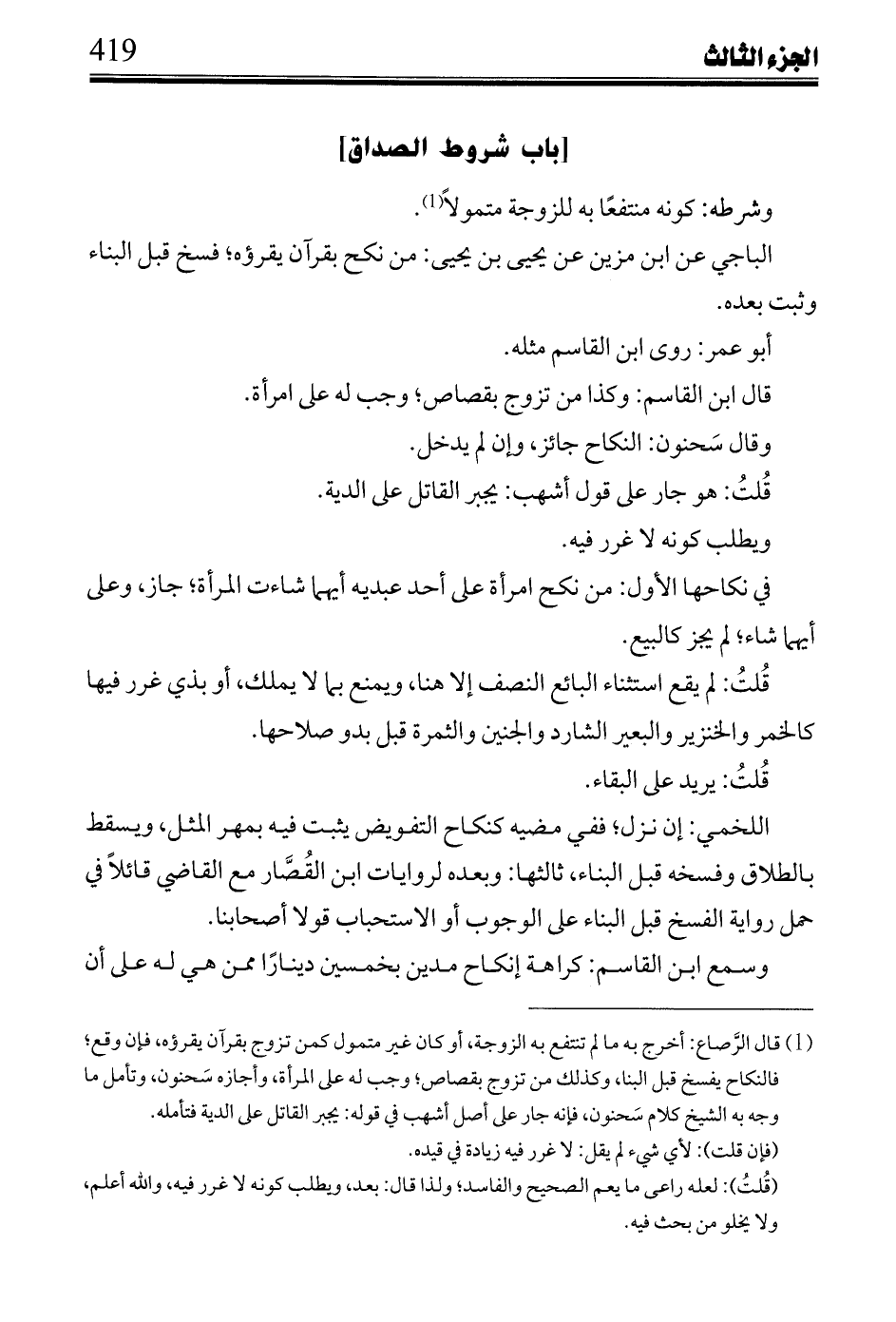 الباجي عن ابن مزين عن يحيى بن يحيى: من نكح بقرآن يقرؤه؛ فسخ قبل البناء وثبت بعده.