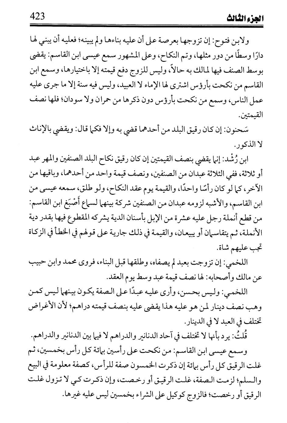 ابن رشد: إنما يقضي بنصف القيمتين إن كان رقيق نكاح البلد الصنفين والمهر عبد أو ثلاثة، ففي الثلاثة عبدان من الصنفين، ونصف قيمة واحد من أحدهما، وباقيها من الآخر، كما لو كان رأسًا واحدًا، والقيمة يوم عقد النكاح، ولو طلق، سمعه عيسى من ابن القاسم، والأشبه لزومه عبدان من الصنفين شركة بينهما لسماع أصبغ ابن القاسم: من قطع أنملة رجل عليه عشرة من الإبل بأسنان الدية يشركه المقطوع فيها بقدر دية الأنملة، ثم يتقاسمان أو يبيعان، والقيمة في ذل جارية على قولهم في الخطأ في الزكاة تجب عليهم شاة.