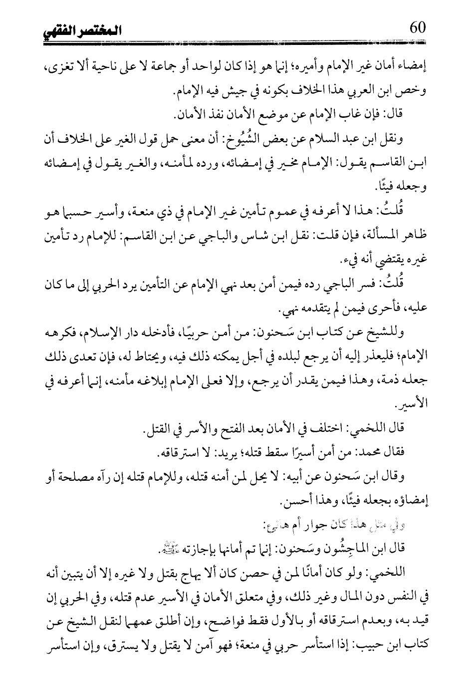 إمضاء أمان غير الإمام وأميره؛ إنما هو إذا كان لواحد أو جماعة لا على ناحية ألا تغزى، وخص ابن العربي هذا الخلاف بكونه في جيش فيه الإمام.