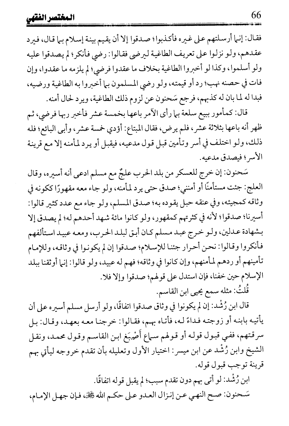 سَحنون: إن خرج للعسكر من بلد الحرب علجٌ مع مسلم ادعى أنه أسيره، وقال العلج: جئت مستأمناً أو أمنني؛ صدق حتى يرد لمأمنه، ولو جاء معه مقهوراً ككونه في وثاقه كمجيئه، وفي عنقه حبل يقوده به، صدق المسلم، ولو جاء مع عدد كثير قالوا: أسيرنا؛ صدقوا؛ لأنه في كثرتهم كمقهور، ولو أنهم مائة شهد أحدهم له؛ لم يصدق إلا بشهادة عدلين، ولو خرج عبد مسلم كان أبق لبلد الحرب، ومعه عبيد استألفهم فأنكروا وقالوا: نحن أحرار جئنا للإسلام؛ صدقوا إن لم يكونوا في وثاقه، وللإمام تأمينهم أو ردهم لمأمنهم، وإن كانوا في وثاقه؛ فهم له عبيد، لو قالوا: إنما أوثقنا ببلد الإسلام حين خفنا، فإن استدل على قولهم؛ صدقوا وإلا فلا.