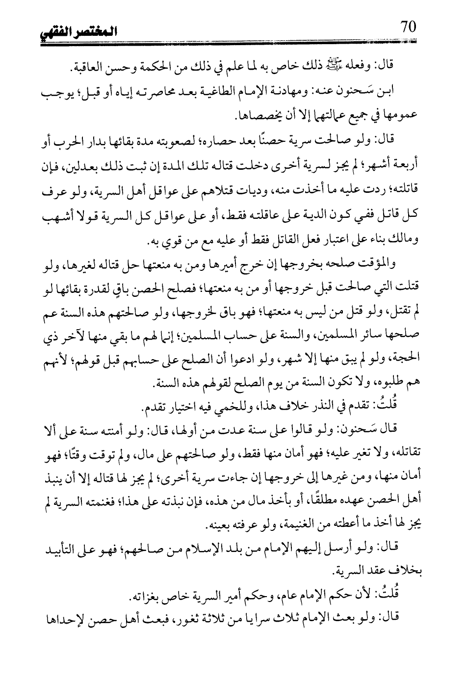 قال سحنون: ولو قالوا على سنة عدت من أولها، قال: ولو أمنته سنة على ألا نقاتله، ولا تغير عليه، فهو أمانة منها فقط، ولو صالحتهم على مال، ولم توقت وقتاً؛ فهو أمان منها، ومن غيرها إلى خروجها إن جاءت سرية أخرى؛ لم يجز لها قتاله إلا أن ينبذ أهل الحصن عهده مطلقاً، أو بأخذ مال من هذه، فإن نبذته على هذا؛ فغنمته السرية لم يجز لها أخذ ما أعطته من الغنيمة، ولو عرفته بعينه.