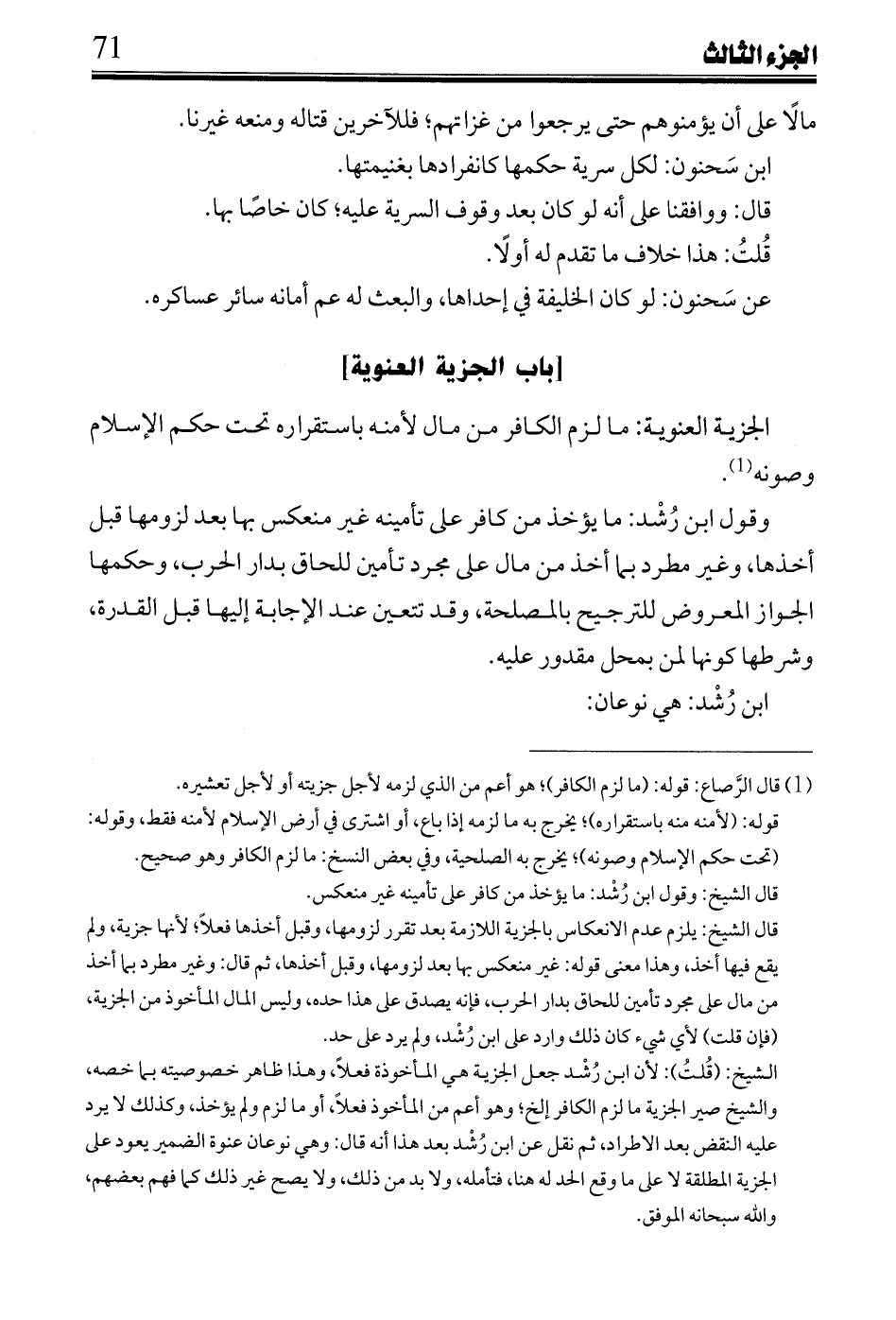 وقول ابن رُشد مايؤخذ من كافر على تأمينه غير منعكس بها بعد لزومها قبل أخذها، وغير مطر بما أخذ من مال على مجرد تأمين للحاق بدار الحرب، وحكمها الجواز المعروض للترجيح بالمصلحة وقد تتعينعند الإجابة إليها قبل القدرة وشرطا كونها لمن بمحل مقدور عليه؟