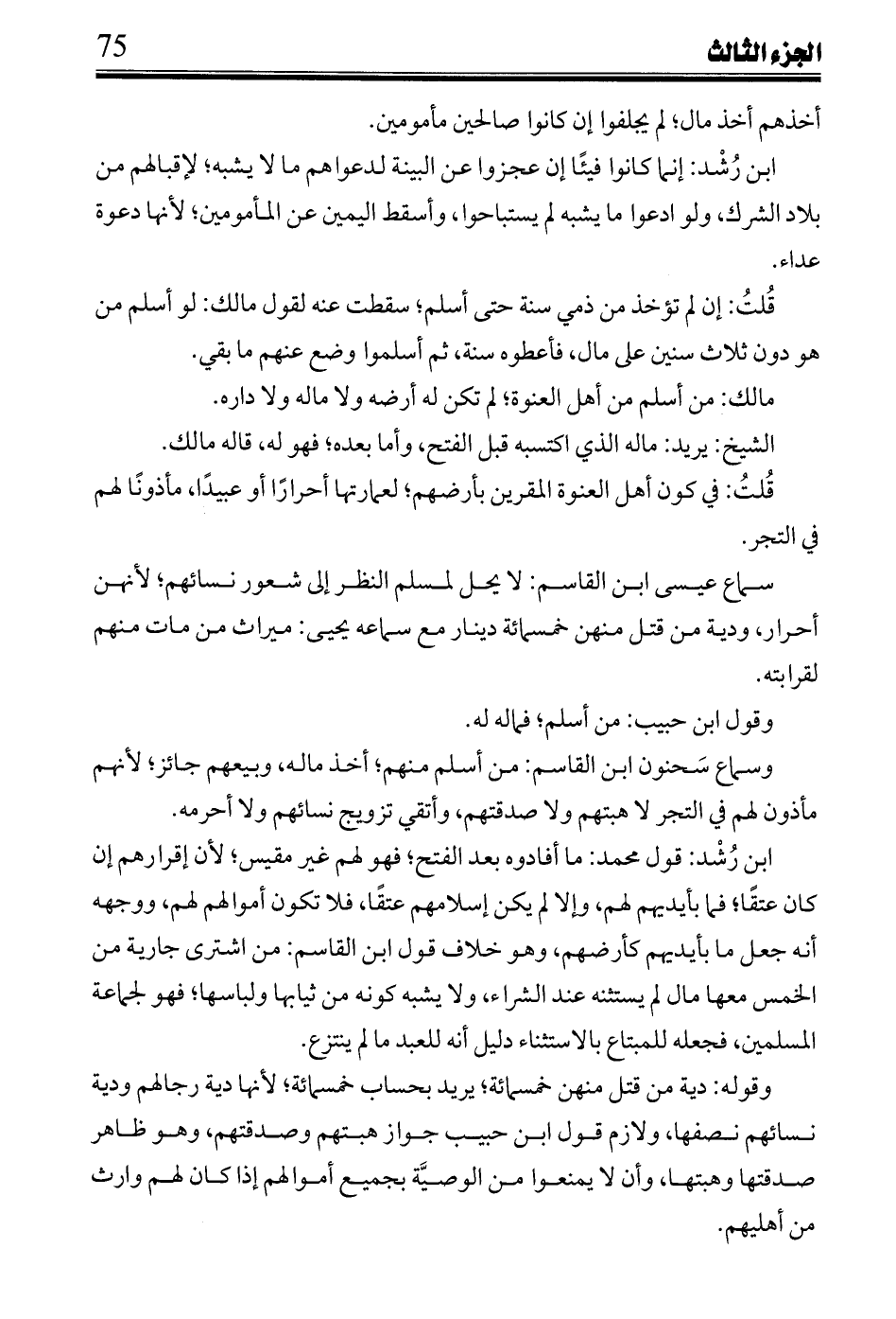 ابن رشد: قول محمد ما أفادوه بعد الفتح؛ فهو لهم غير مقيس؛ لأن إقرارهم إن كان عتقاً، فما بأيديهم، وإلا لم يكن إسلامهم عتقا، فلا تكون أموالهم لهم، ووجهة أنه جعل مابأيديهم كأرضهم، وهو خلاف قول ابن القاسم: من اشترى جارية من الخمس معها لم يستثنه عند الشراء، ولا يشبه كونه من قيابها ولباسها، فهو لجماعة المسلمين، فجعله للمبتاع بالاستثناء دليل أنه للعبد مالم ينتزع.