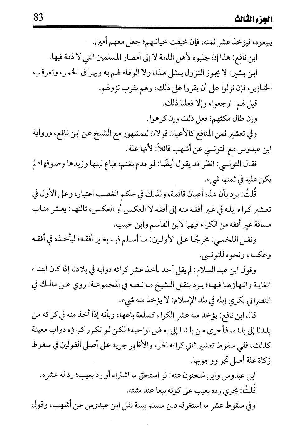 وقول ابن عبد السلام: لم يقل أحد بأهذ عشر كرائه دوابه في بلادنا إذا كان ابتداء ابغاية وانتهاءها فيهان يرد بنقل الشيخ ما نصه في المجموعة، روي عن مالك في النصراني بكري إبله في بلد الإسلام: لا يؤخذ منه شيء.