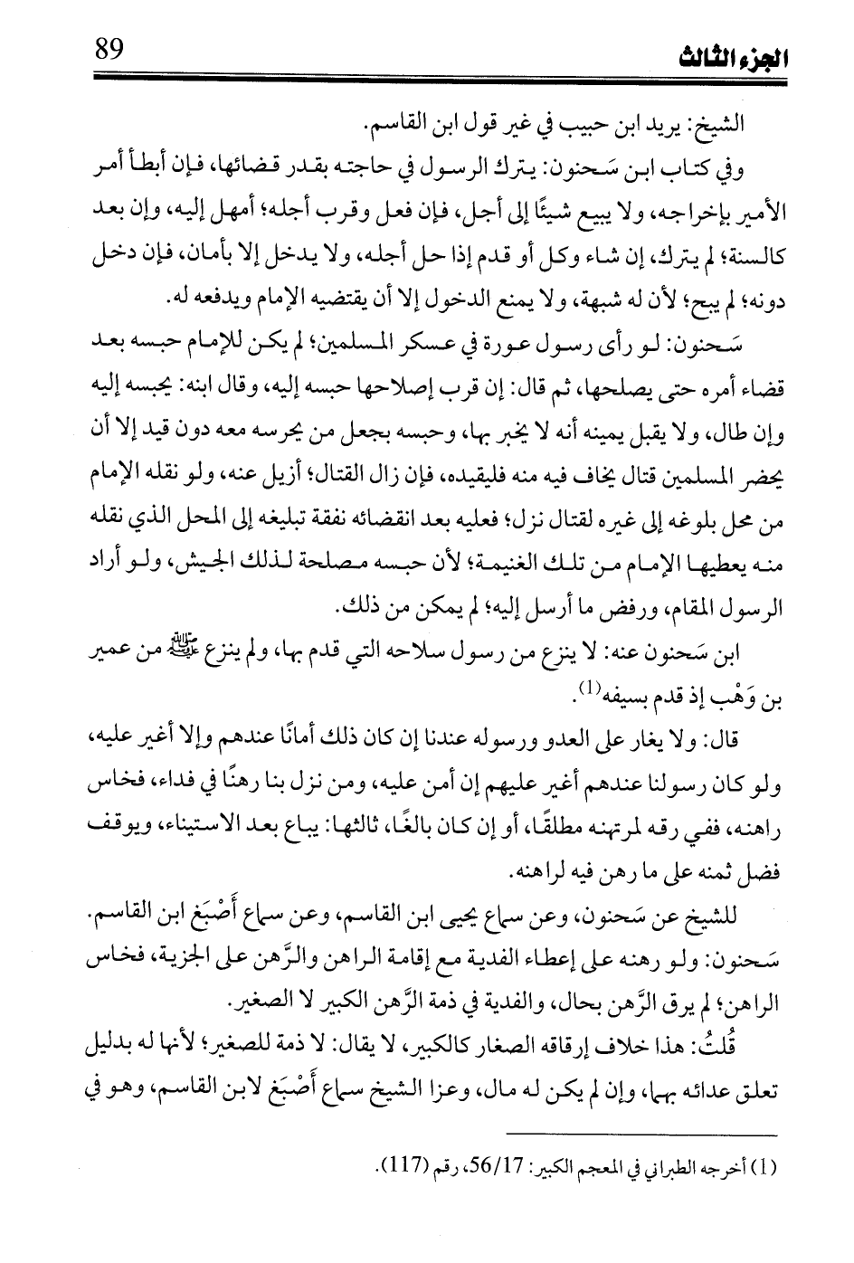 ابن سحنون عنه: لا ينزع من رسول سلاحه التي قدم بها، ولم ينزع صلى الله عليه وسلم من عمير بن وهب إذ قدم بسيفه.