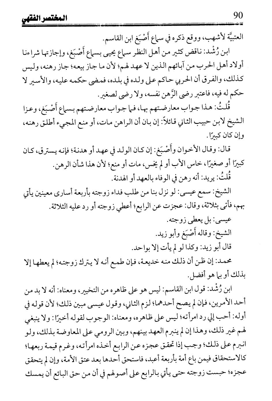 ابن رشد: ناقض كثير من أهل النظر سماع يحيى بسماع أصبغ، وإجازتها شراءنا أولاد أهل الحرب من آبائهم الذين لا عهد لهم؛ لأن ما جاز بيعه؛ جاز رهنه، وليس كذلك، والفرق أن الحربي حاكم على ولده في بلده، فمضى حكمه عليه، والأسير لا حكم له فيه، فاعتبر رضى الرهننفسه، ولا رضى لصغير.
