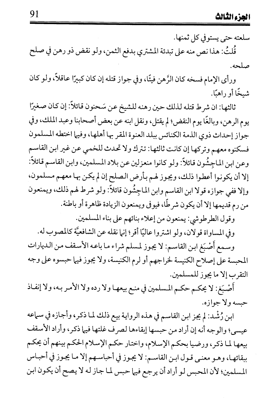ثالثهما: ان شرط قتله لذلك حين رهنه للشيخ عن سحنون قائلاً: إن كان صغيراً يوم الرهن، وبالغاً يوم النقض؛ لم يقتل، ونقل ابنه عن بعض أصحابنا وعبد الملك، ويف جواز إحداث ذوي الذمة الكنائس ببلد العنوة المقر بها أهلها، وفيما اختطه المسلمون فسكنوه معهم وتركها إن كانت ثالثها: تترك ولا تحدث للخميعنغير ابن القاسم وعن ابن الماجشون قائلاً: ولو كانوا منعزلين عن بلاد المسلمين، وابن القاسم قائلاً: إلا أن يكونوا أعطوا ذلك، ويجوز لهم بأرض الصلح إن لم يكن بها معهم مسلمون، وإلا ففي جوازه قولاً ابن القاسم وابن الماجشون قائلاً: ولو شرط لهم ذلك، ويمنعون من رم قديمها إلا أن يكون شرطاً، فيوفى ويمنعون الزيادة ظاهرة أو باطنة.